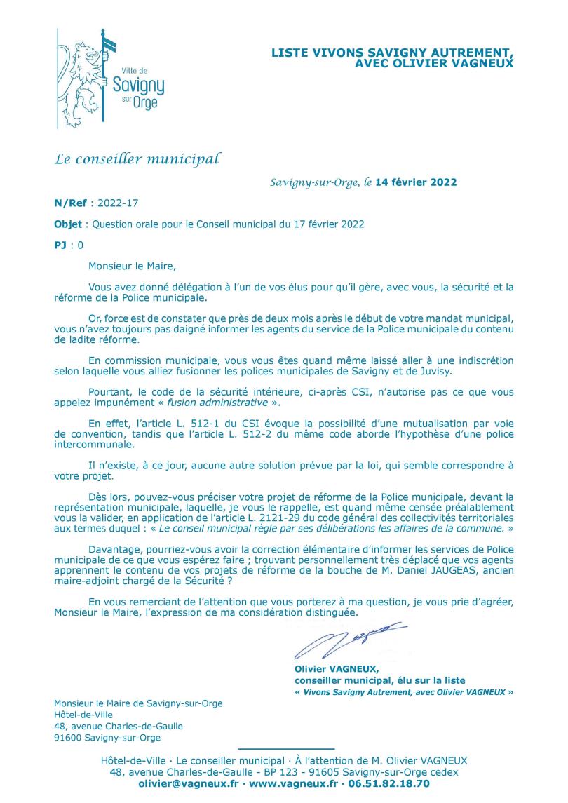 - d’une part, il se vante de ne vouloir réaliser que la « fusion administrative » des polices municipales de Savigny et de Juvisy ;