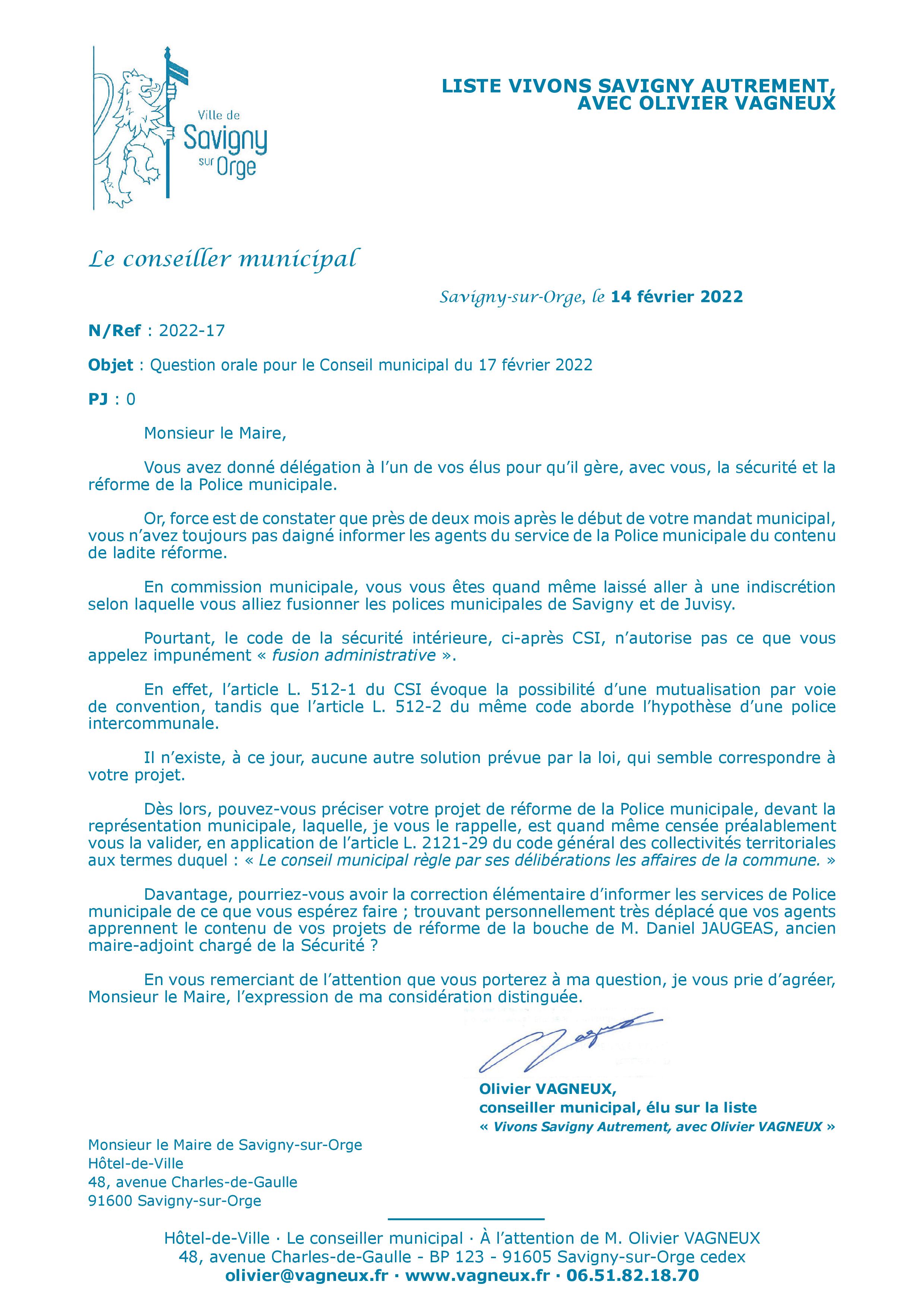 - d’une part, il se vante de ne vouloir réaliser que la « fusion administrative » des polices municipales de Savigny et de Juvisy ;