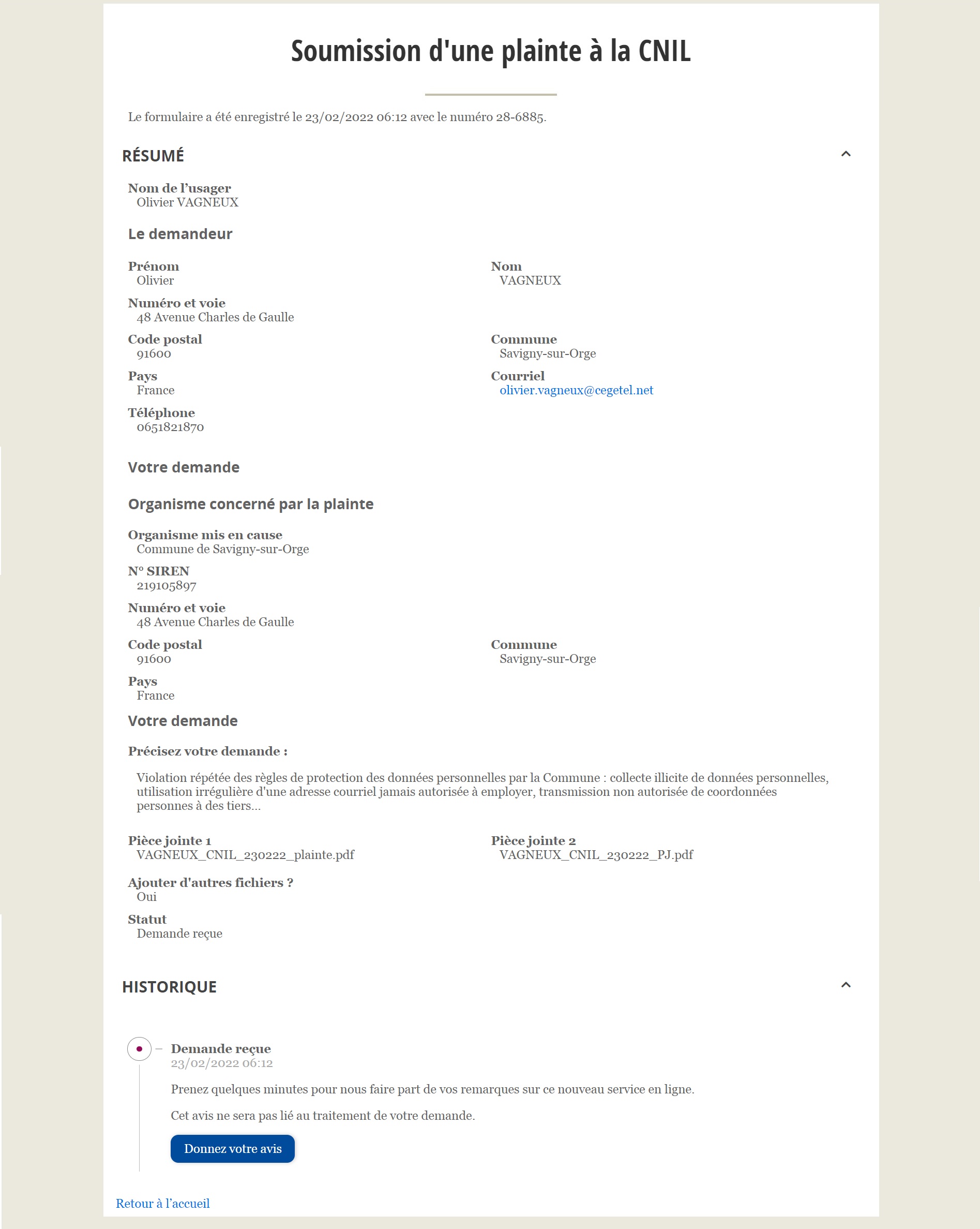 Je soussigné Olivier VAGNEUX, conseiller municipal de Savigny-sur-Orge (Essonne), domicilié en cette qualité en l’Hôtel-de-Ville de la Commune, sis 48, avenue Charles-de-Gaulle – BP 123 – 91605 Savigny-sur-Orge, joignable aux coordonnées suivantes : 06.51.82.18.70 et olivier@vagneux.fr, souhaite vous signaler une atteinte récurrente aux règles de protection de mes données personnelles par l’administration municipale de Savigny-sur-Orge.