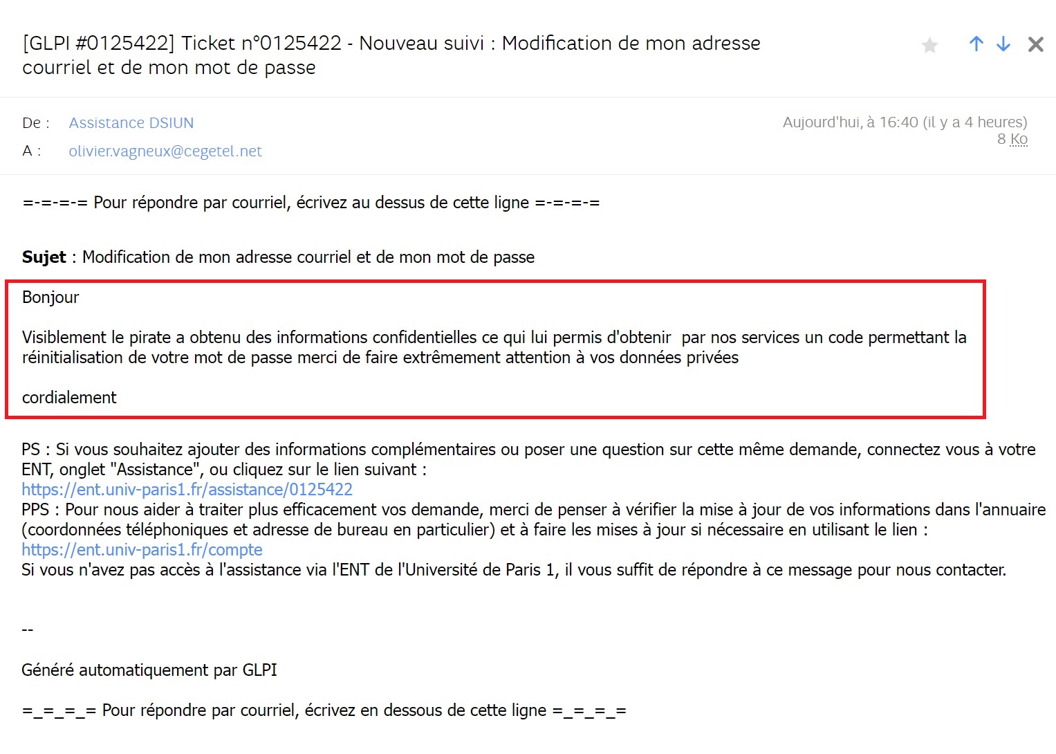 Dans tous les cas, ma situation a été examinée lors de leur réunion hebdomadaire et les 4 techniciens du service ont été sermonnés ce mercredi matin pour leur rappeler les procédures, et notamment de ne modifier les adresses courriels et mots de passe qu’en présence d’une preuve de l’identité du demandeur, par exemple en lui demandant de se déplacer ou de montrer une carte étudiante par Zoom.