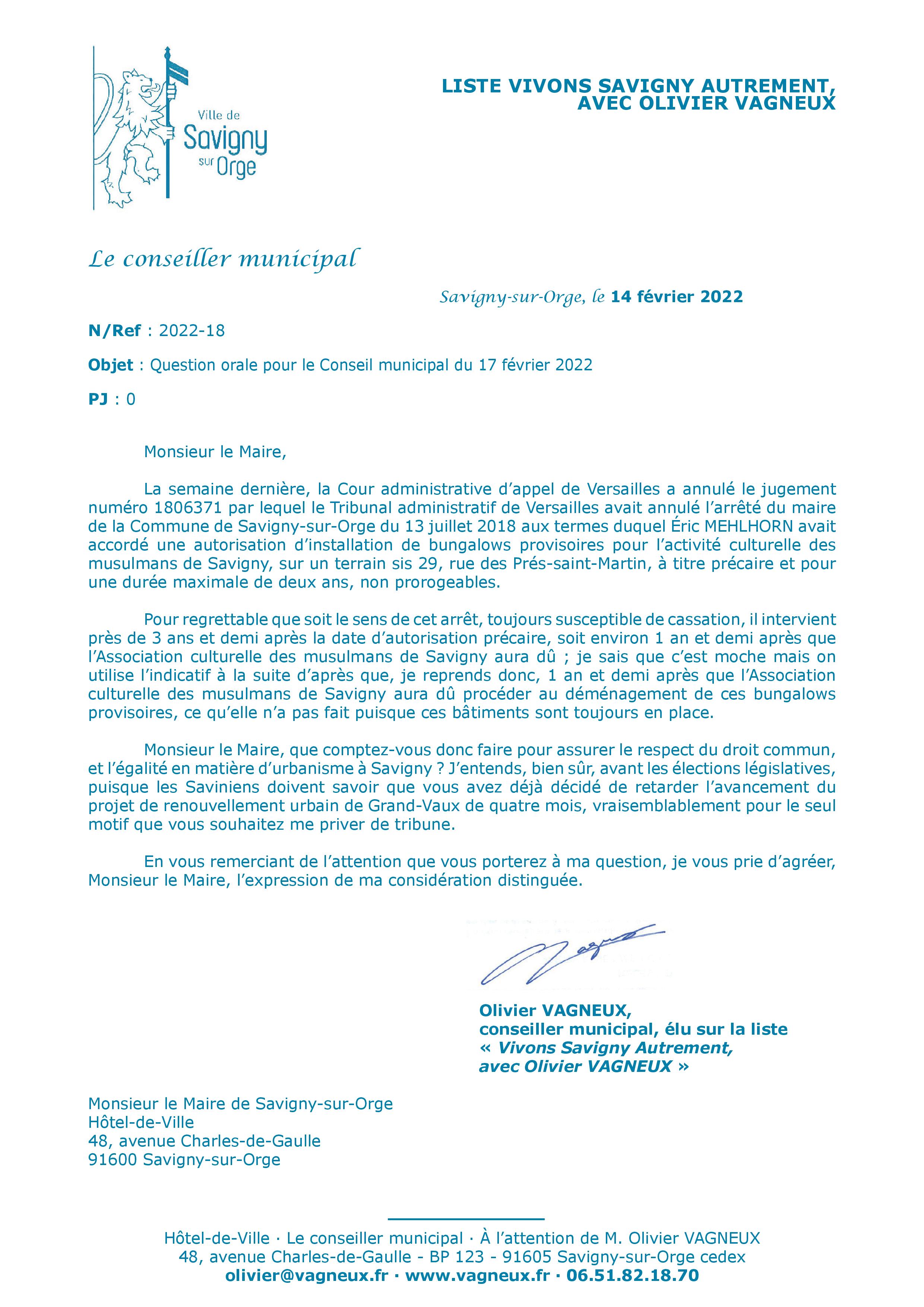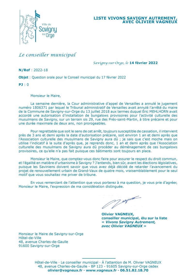 Non, mais merde, c’est déjà hyper galère d’aller coller des affiches le vendredi, ou simplement de traverser la rue pour rejoindre la N7 ; la Police municipale de Savigny ne se déplace même plus, pas plus que la nationale. Et ils se trouvent des juges administratifs pour dire qu’il n’y a aucun problème de nuisance provoquée par une mosquée de 590 places avec 20 places de parkings… C’est cela, on vous croît !