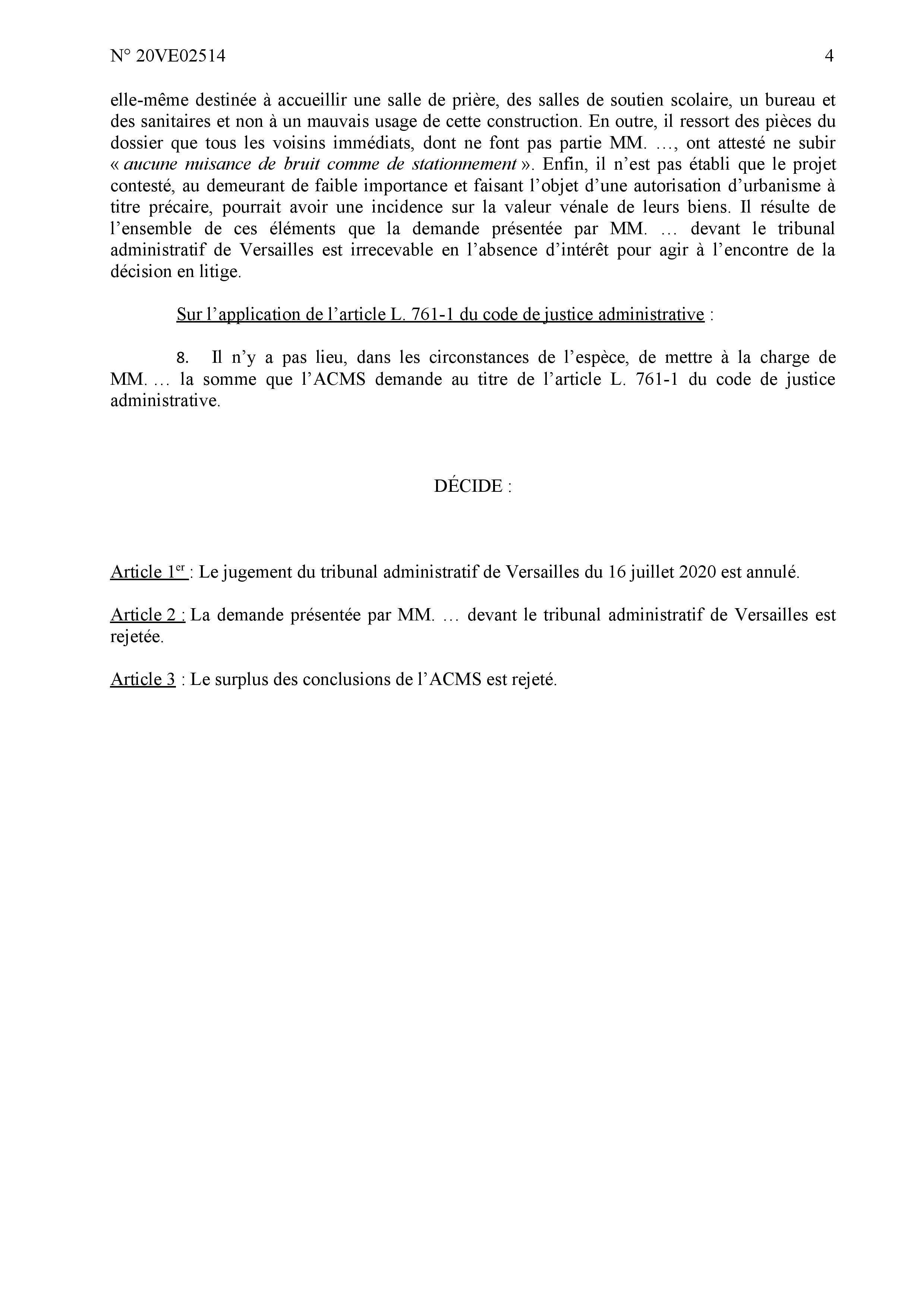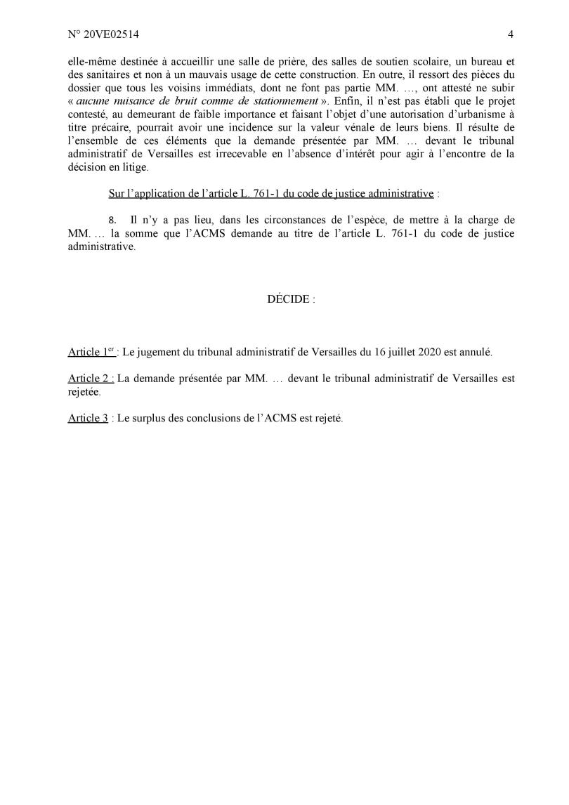 Et encore quelle forme ! Parce que l’arrêt fait grief aux requérants de n’avoir pas fait la preuve qu’ils habitent chez eux. Davantage, parce qu’elle préfère donner corps aux témoignages des voisins musulmans de la mosquée qui ont vraisemblablement commis des attestations de complaisance pour dire qu’il n’y a pas de nuisance. Donc c’est qu’il n’y a pas de nuisance… Parole contre parole…
