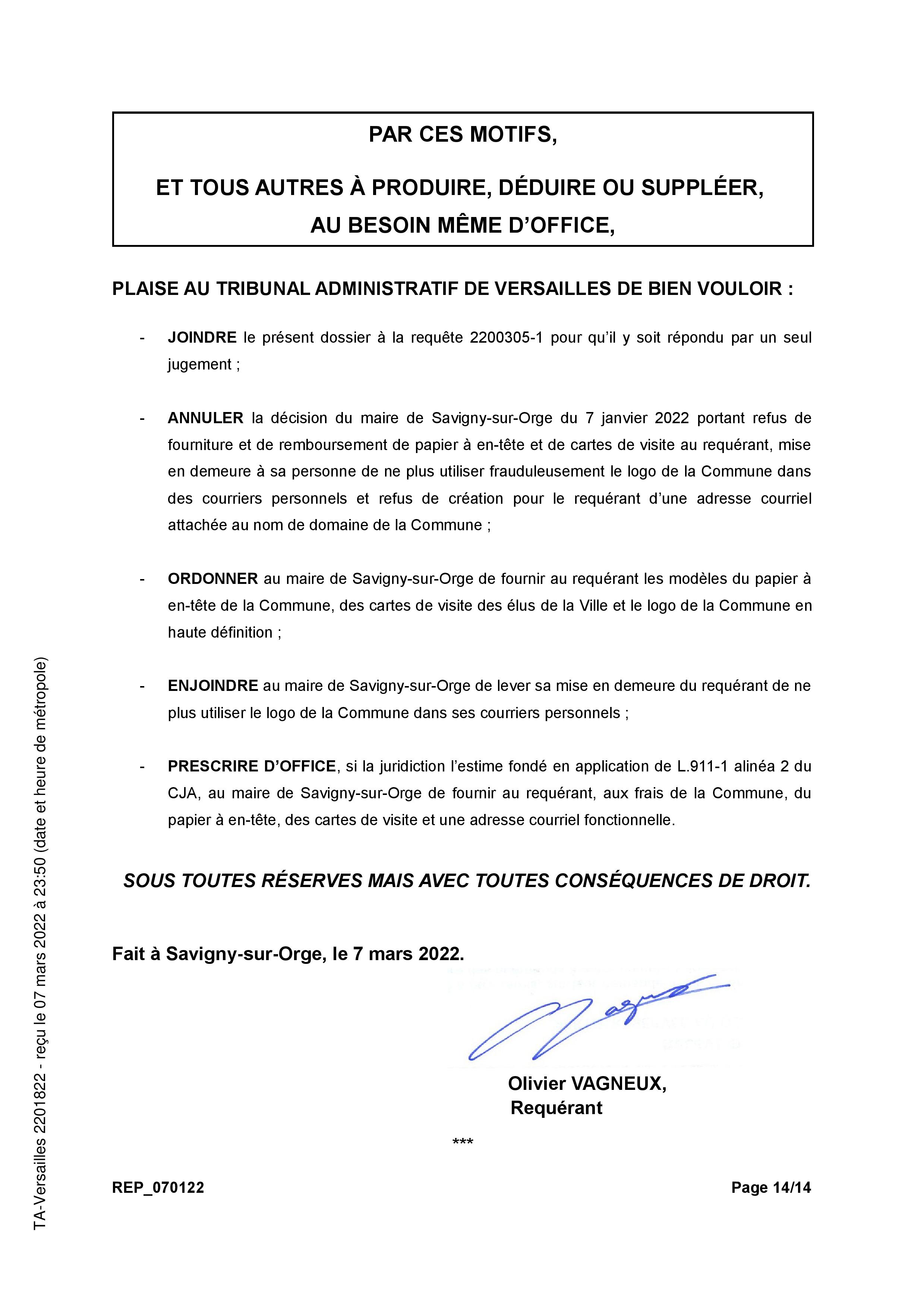 Entre nous, je vois mal comment le Tribunal administratif va pouvoir ordonner de me fournir des cartes de visite, du papier à en-tête et une adresse courriel fonctionnelle, parce que c’est illégal et que personne ne devrait pouvoir en disposer, ainsi fourni par la Commune, à Savigny, sinon le maire.