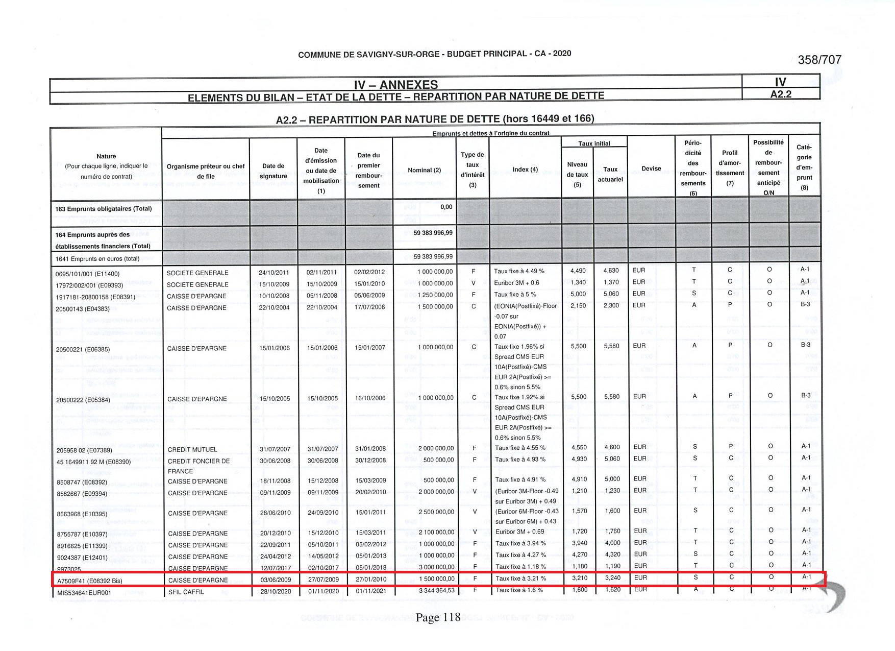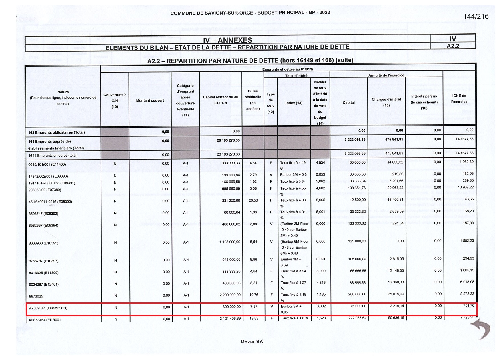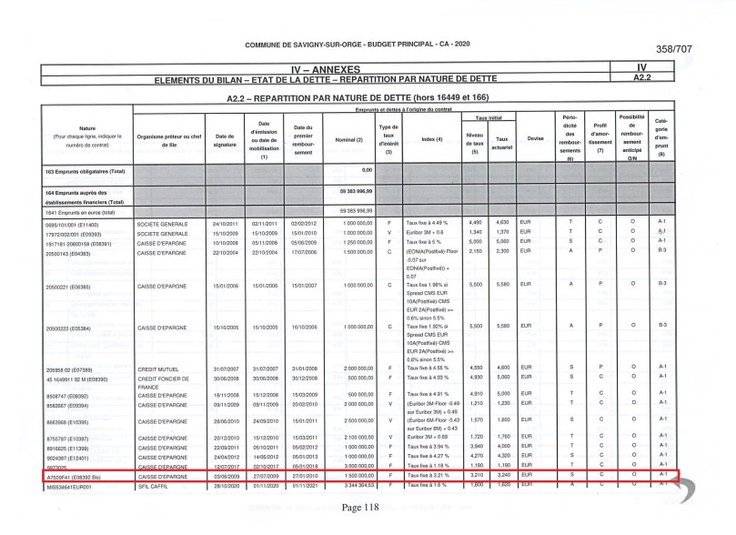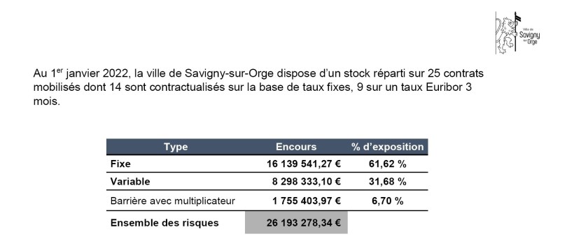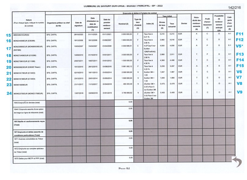 Pour eux, chez qui 14 + 9 = 25 (chez moi, cela fait 23), la Commune de Savigny dispose de 25 emprunts contractualisés dont 14 à taux fixe et 9 en Euribor 3 mois.