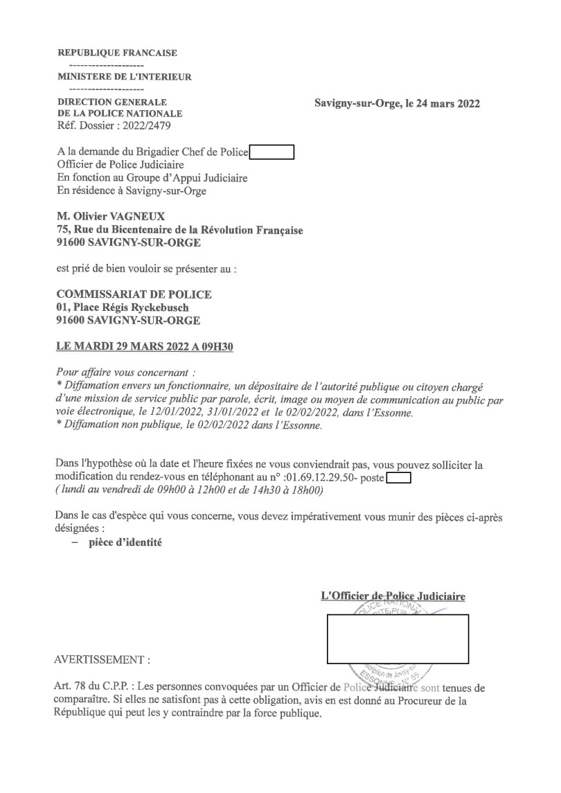 Bref, nouvelle convocation aujourd’hui (pour la même audition) ! Même si je ne comprends toujours pas où est la diffamation non publique du 2 février… À qui aurais-je pu parler d’elle en privé ?