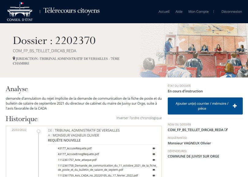 Cette requête a été enregistrée le vendredi 25 mars 2022 sous le numéro d’instance 2202370 par le greffe du Tribunal administratif de Versailles.
