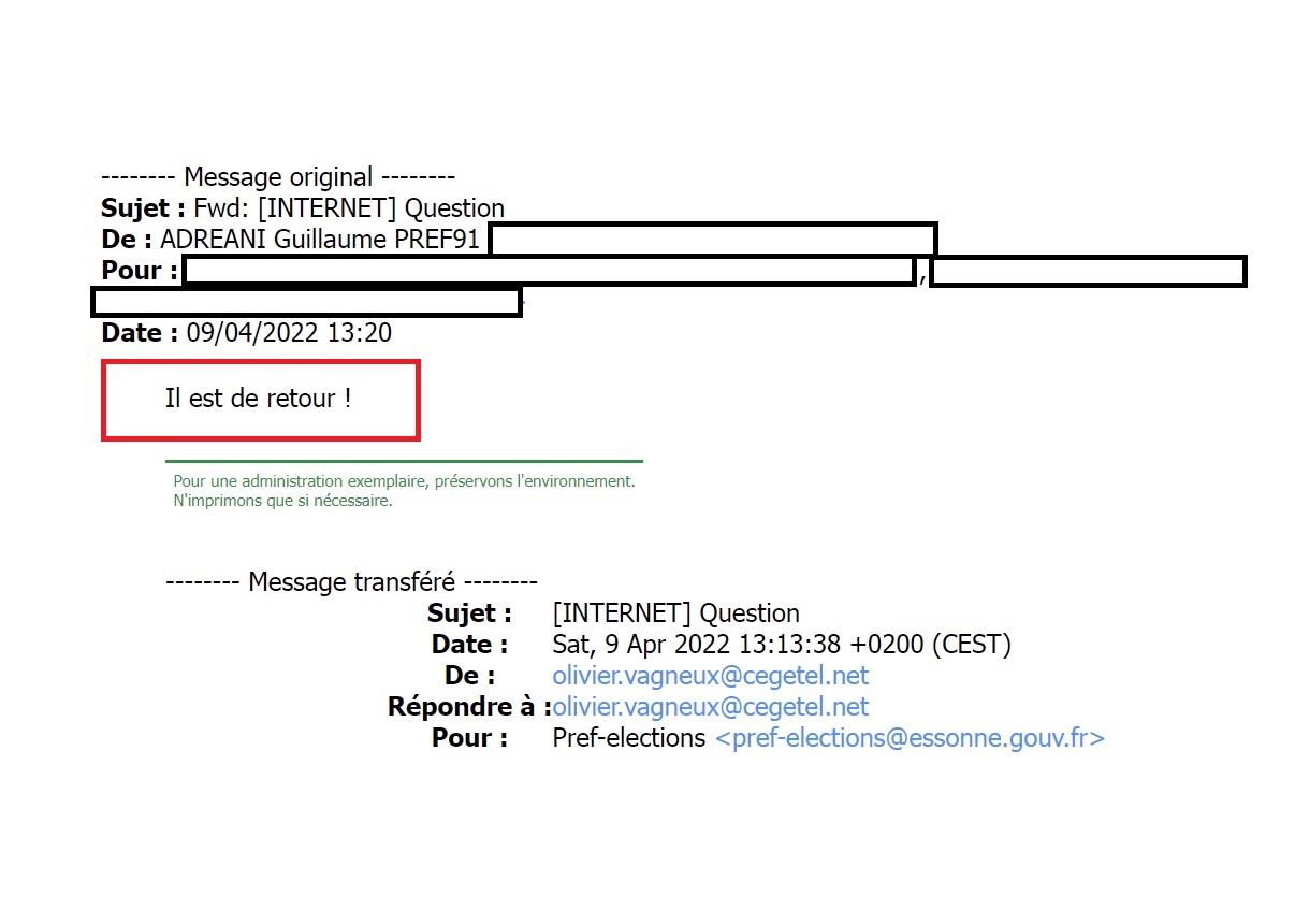 Ils ont oublié d’effacer le petit commentaire superfétatoire du responsable du service Élections de la préfecture de l’Essonne à mon endroit, avant de me répondre, avec l’adresse générique du service.