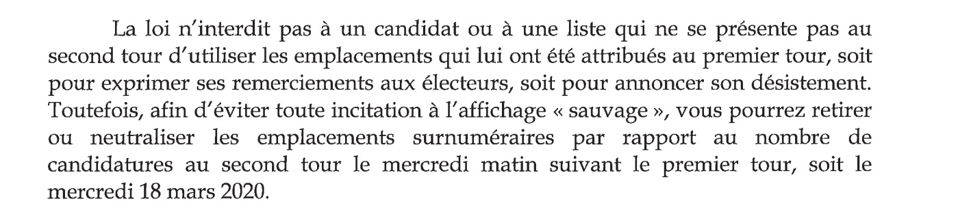 C’est d’ailleurs ce qui figure dans les différentes circulaires afférentes aux autres élections, lesquelles ne permettent habituellement de retirer ou neutraliser les emplacements surnuméraires que le mercredi matin suivant le premier tour.