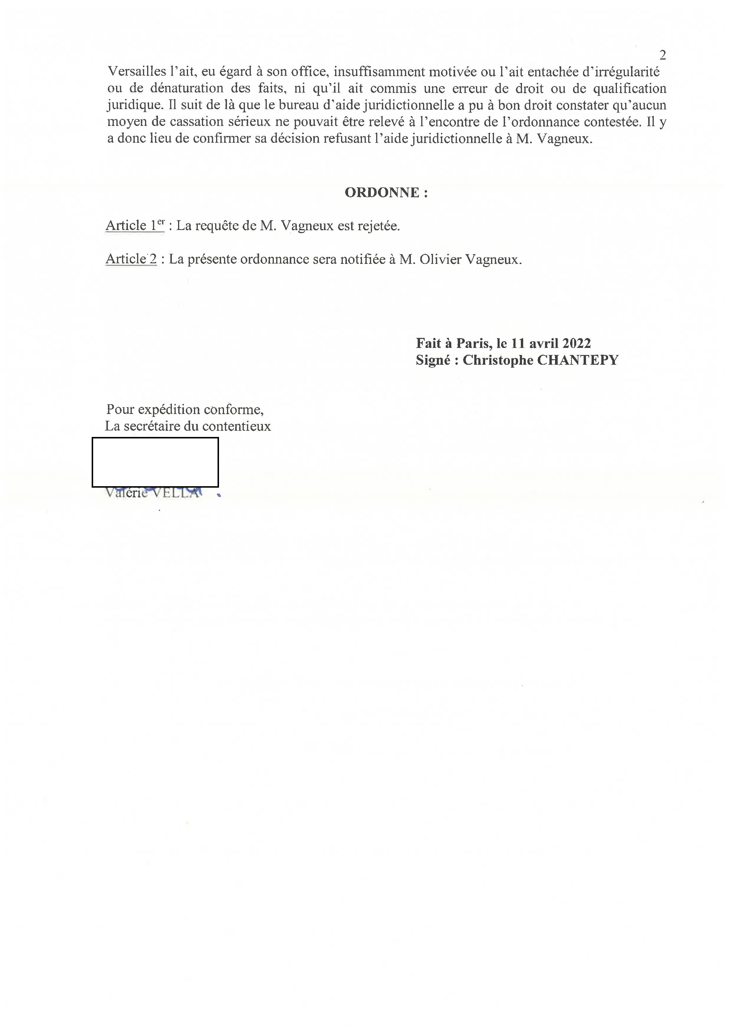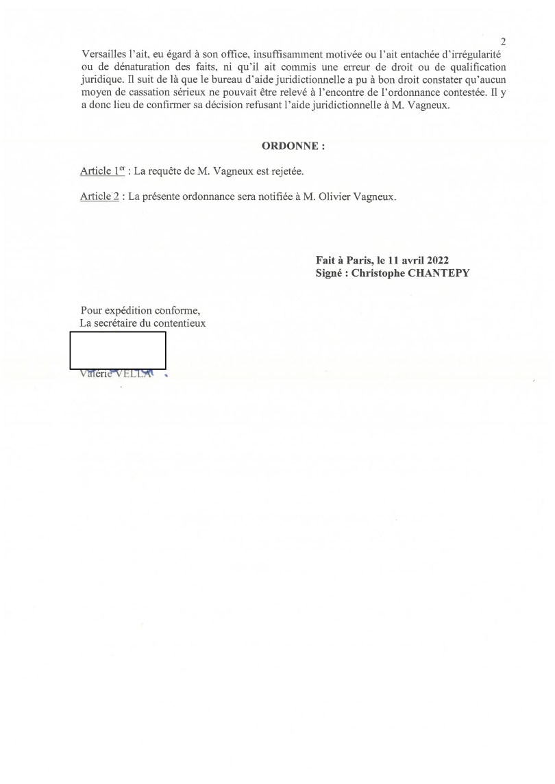 Sans aide juridictionnelle, je renonce à me pourvoir en cassation contre l’ordonnance de référé suspension du juge des référés du Tribunal administratif de Versailles.