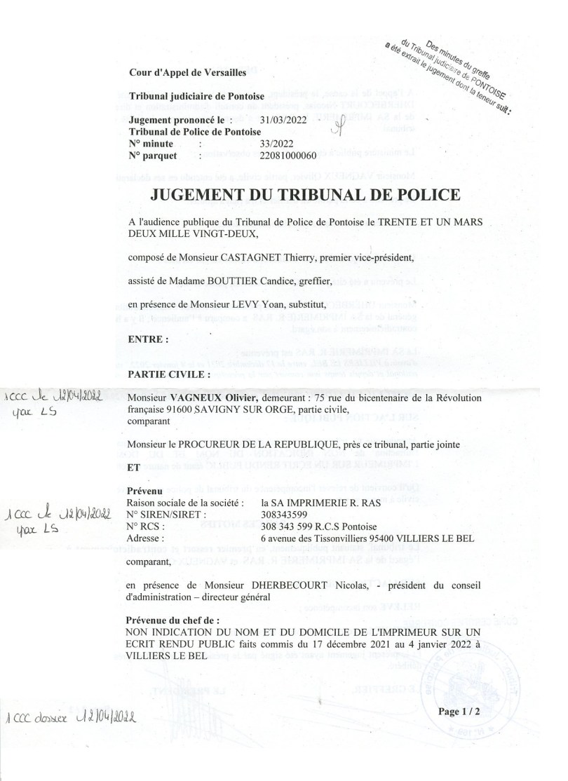 Qu’à cela ne tienne, je vais mieux me pourvoir en citant l’imprimerie cette fois devant le Tribunal correctionnel (au lieu du Tribunal de police).