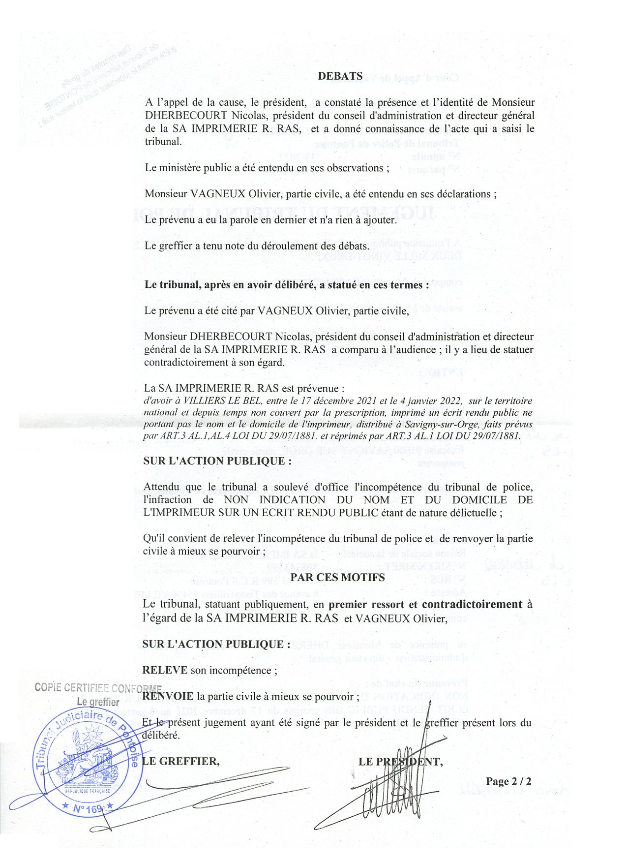 Qu’à cela ne tienne, je vais mieux me pourvoir en citant l’imprimerie cette fois devant le Tribunal correctionnel (au lieu du Tribunal de police).