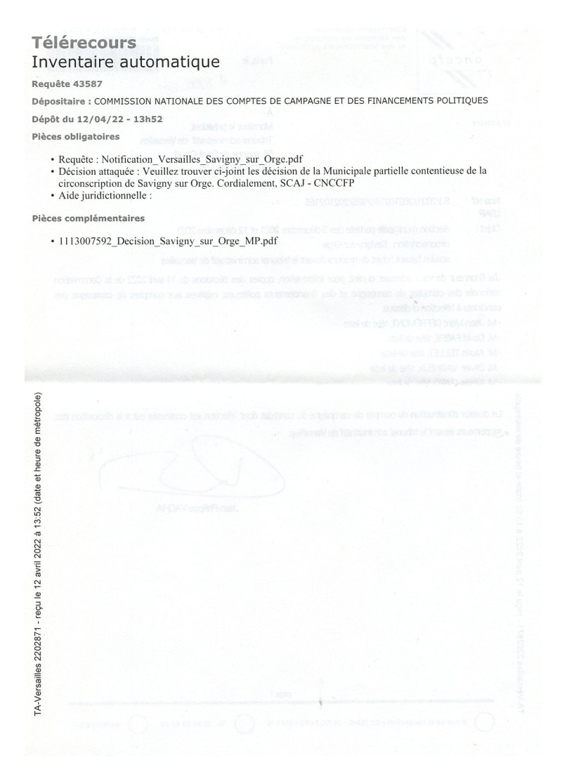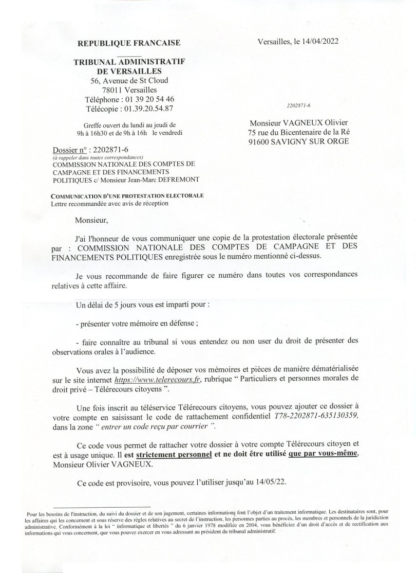 « Le dossier d’instruction du compte de campagne du candidat dont l’élection est contestée est à la disposition des rapporteurs devant le Tribunal administratif de Versailles. »