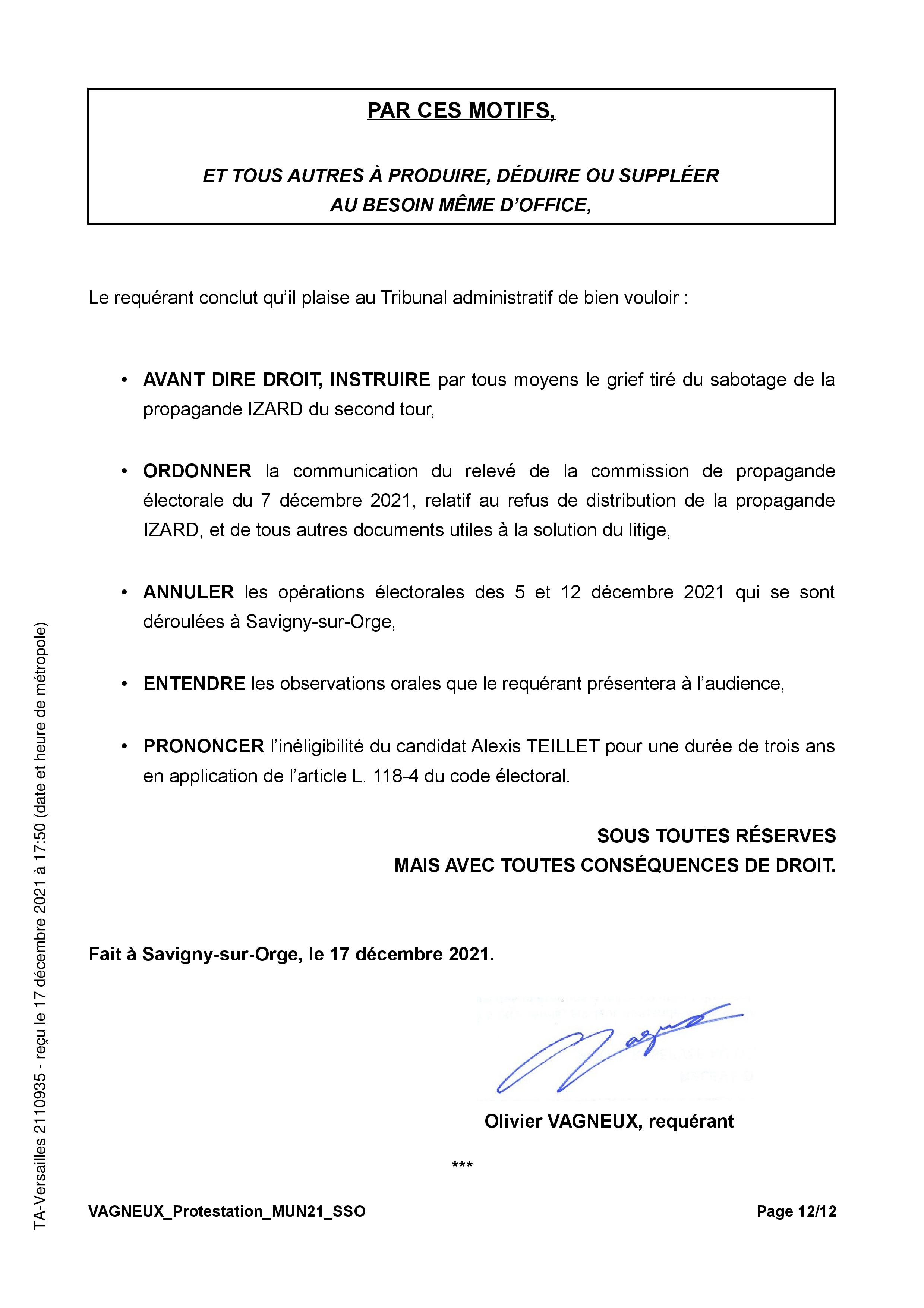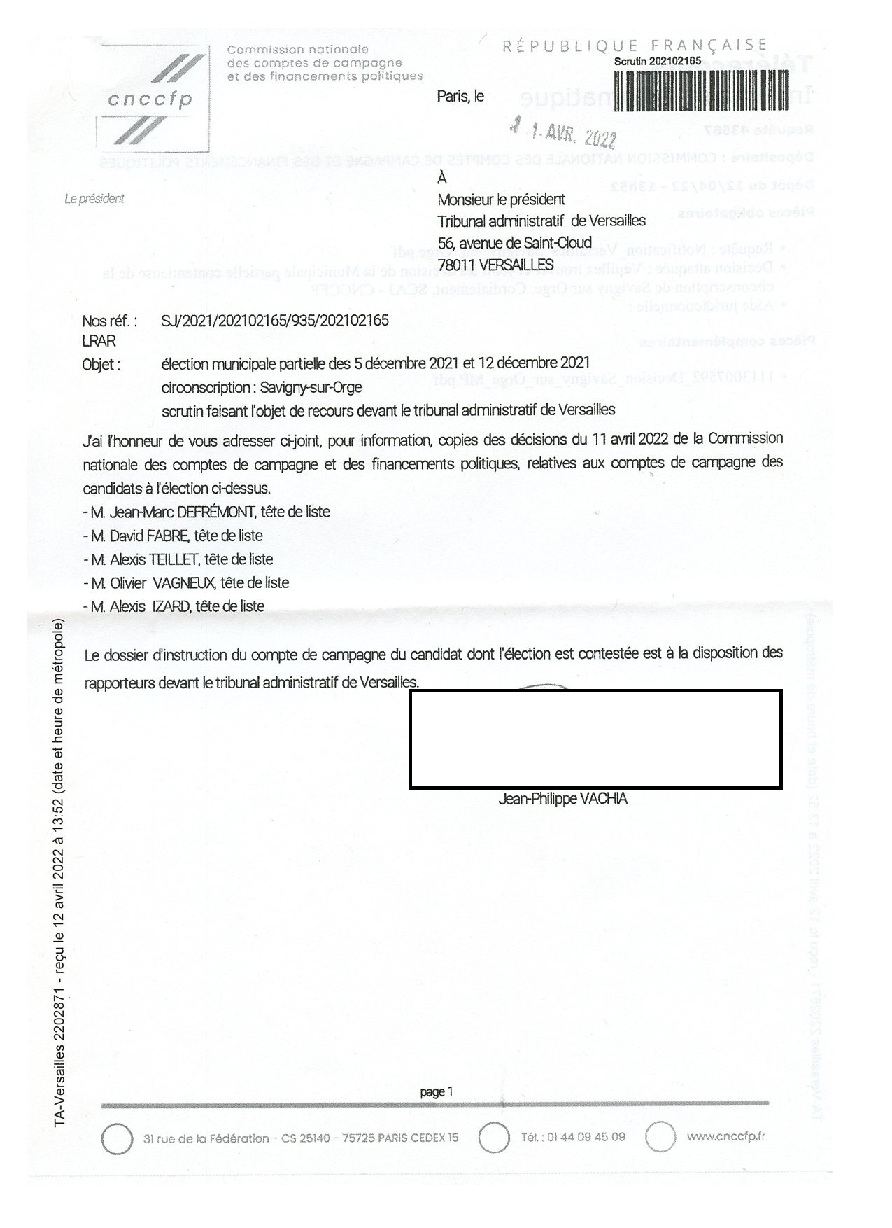 « Le dossier d’instruction du compte de campagne du candidat dont l’élection est contestée est à la disposition des rapporteurs devant le Tribunal administratif de Versailles. »