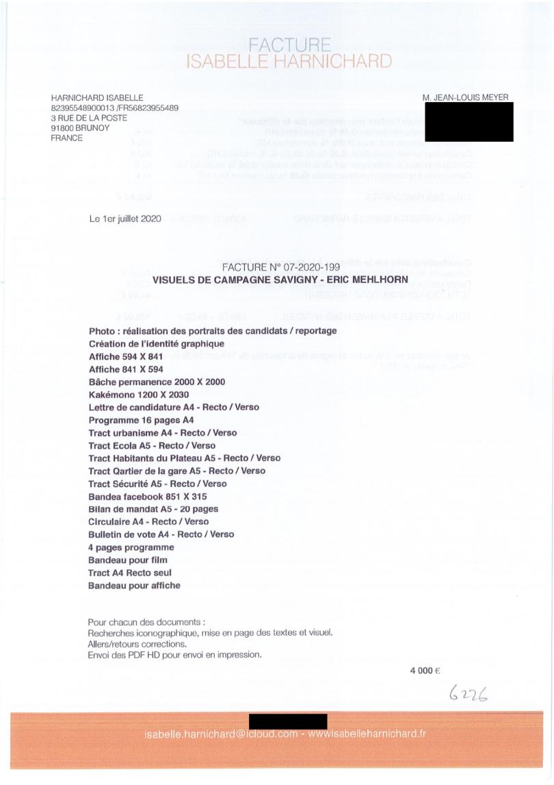 Pour la campagne municipale de mars et juin 2020, feu Éric MEHLHORN, petit ange parti trop vite du microcosme politique savinien dans lequel absolument personne ne le regrette, avait fait appel aux services d’Isabelle HARNICHARD, bien connue dans le milieu, pour la réalisation des portraits de ses colistiers et pour les infographies de ses documents de campagne, pour la somme très raisonnable de 4 000 euros, vraisemblablement ramenée ensuite à 3 400 euros (Jean-Louis MEYER nous confirmera).