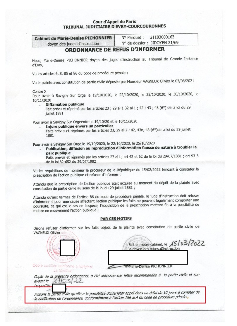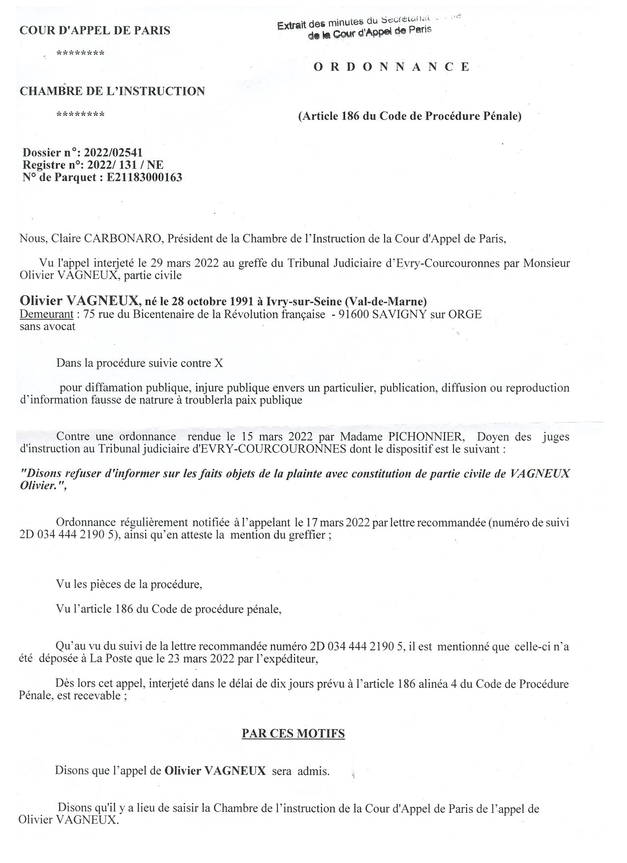Dans mes motifs d’appel de l’ordonnance querellée, je visais une jurisprudence constante de la chambre criminelle de la Cour de cassation qui dispose que :