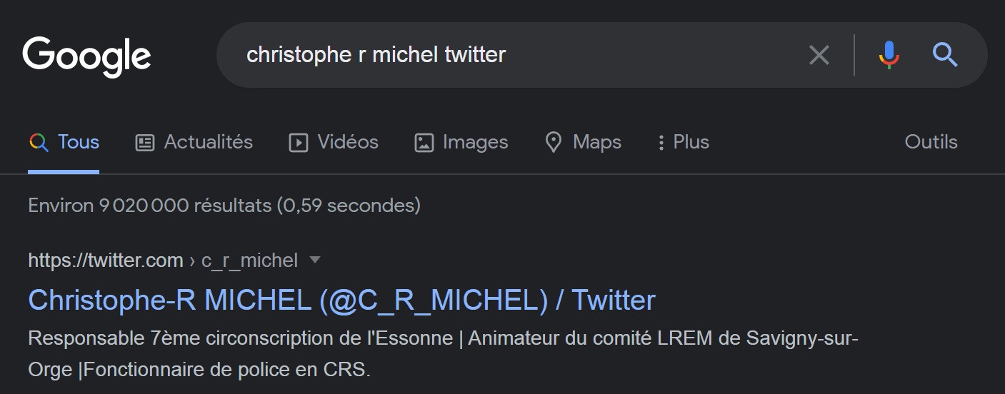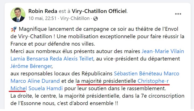 Dans ma revue de presse quotidienne du 18 mai 2022, Christophe-Reynald MICHEL, qui a changé sa bannière Twitter en indiquant « élu Savigny-sur-Orge » : https://twitter.com/C_R_MICHEL