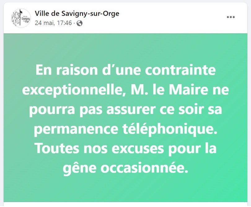 Tout cela pour vous dire que puisque TEILLET propose des permanences téléphoniques, sur des créneaux qu’il ne peut pas tenir, et qu’il est en permanence en train de les annuler (cf le Facebook de la Ville), appelez-le donc, en tant que soutien de REDA ; visiblement, il sera tout à coup plus disponible…