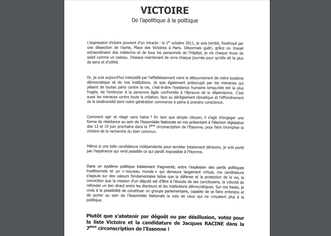 Finalement, ce qui me surprend le plus dans cette candidature, est que Jacques RACINE ne s’adresse qu’aux abstentionnistes, donc qu’il décrète une impossibilité, là où il se veut le candidat de tous les possibles.