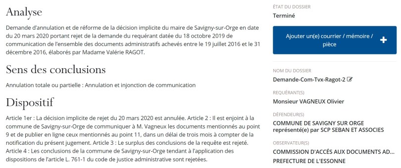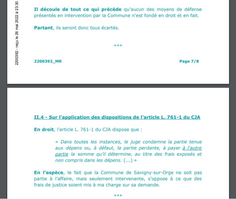 Et puis arrêtez de mettre des avocats sur le coup à 850 euros HT pour prononcer 10 mots (« Monsieur le Président, je m’en rapporte à mes écritures ») ! Envoyez Sandra ALVES, ou même Jordan HAYERE, notre nouveau PRADA (personne responsable de l’accès aux documents administratifs), comme les autres communes envoient leurs directeurs des affaires juridiques… Je les latterai tout autant que ce que je latte vos avocats mais nous aurons fait de sérieuses économies.