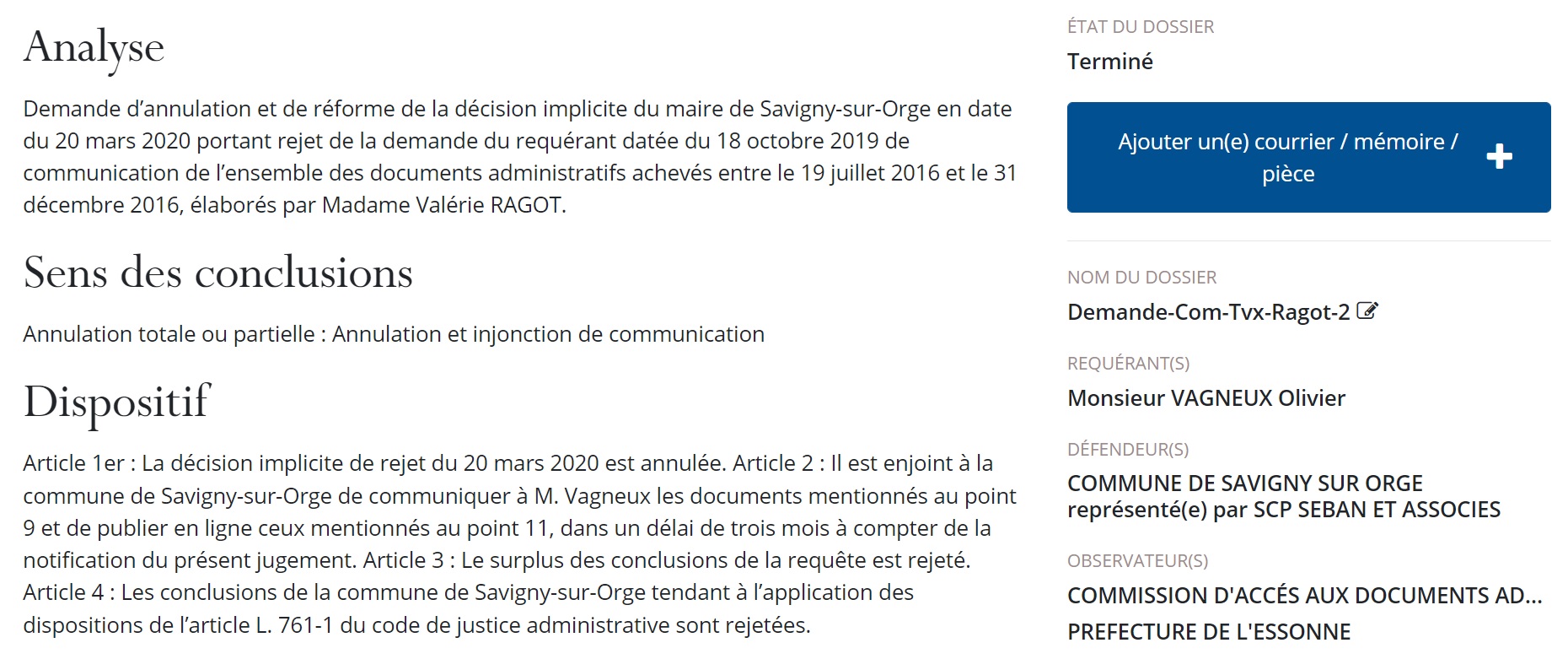 Et puis arrêtez de mettre des avocats sur le coup à 850 euros HT pour prononcer 10 mots (« Monsieur le Président, je m’en rapporte à mes écritures ») ! Envoyez Sandra ALVES, ou même Jordan HAYERE, notre nouveau PRADA (personne responsable de l’accès aux documents administratifs), comme les autres communes envoient leurs directeurs des affaires juridiques… Je les latterai tout autant que ce que je latte vos avocats mais nous aurons fait de sérieuses économies.
