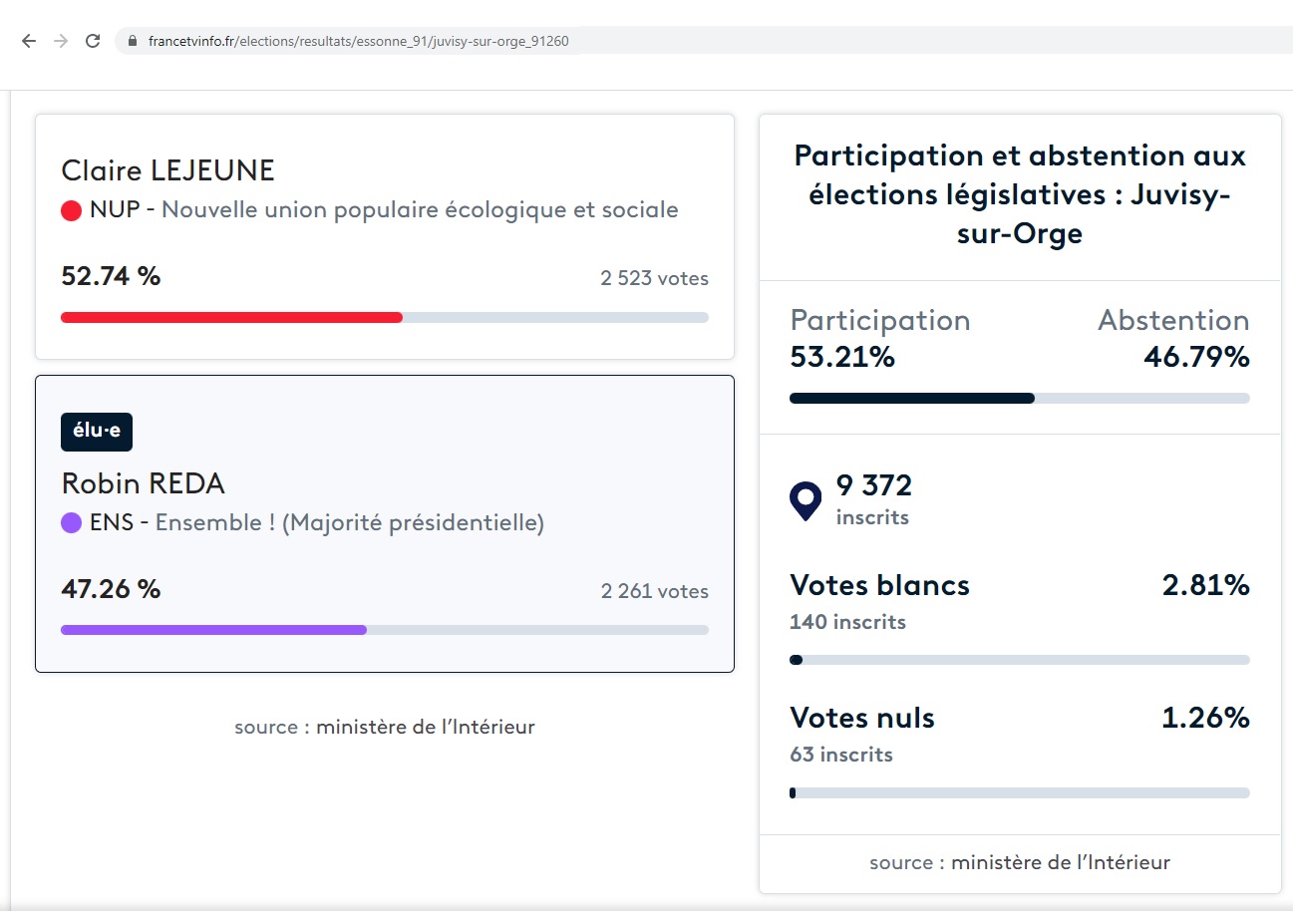 Robin REDA est battu chez lui, à Juvisy ! De 250 voix environ !
