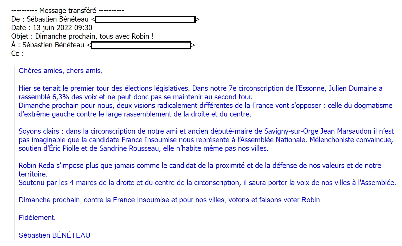 Utiliser le fichier courriel des adhérents de la 7e circonscription pour leur annoncer, faussement, que le parti avait décidé qu’il fallait voter REDA au second tour de la législative…