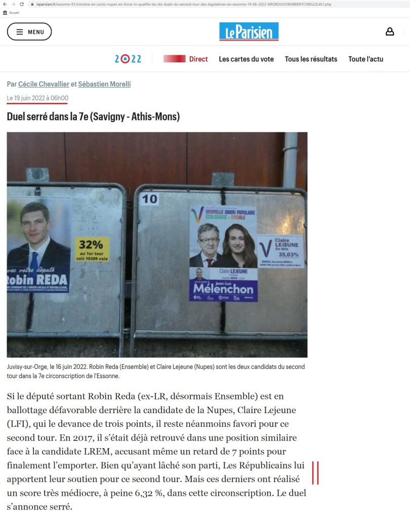 Mais je combine cela, en réalité, avec l’article du Parisien, paru le dimanche 19 juin 2022, jour de l’élection, à 6 heures 00 du matin (en capture d’écran en bas d’article), annonçant faussement que le parti LR soutenait Robin pour le second tour, alors que, Alerte Spoiler !, ce n’était pas vrai…