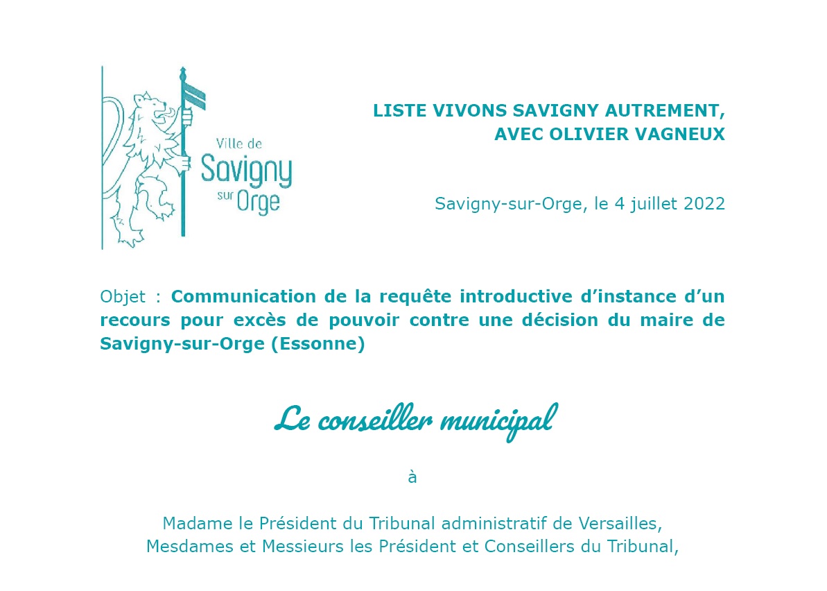POUR : Monsieur Olivier VAGNEUX, agissant en qualité de conseiller municipal de la Commune de Savigny-sur-Orge, demeurant sis 75, rue du Bicentenaire de la Révolution française – 91600 Savigny-sur-Orge, domicilié en cette qualité en l’Hôtel-de-Ville de la Commune, sis 48, avenue Charles-de-Gaulle – 91600 Savigny-sur-Orge