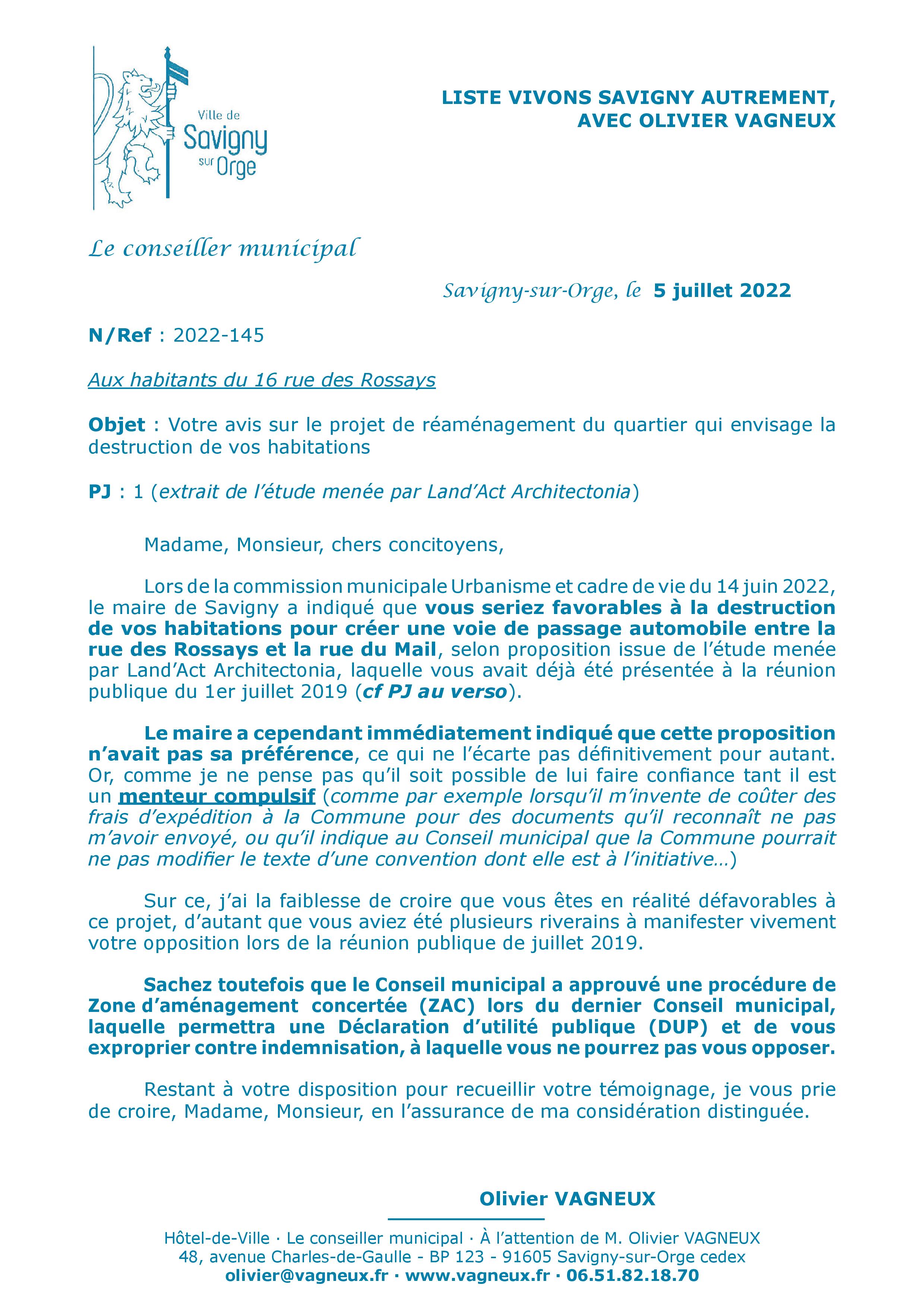 Alors que le maire de Savigny, qui lui est un gentil, préfère laisser ces bonnes gens dans l’ignorance, avec pour seule promesse orale qu’il ne fera rien du projet dont il ne veut pas leur parler…
