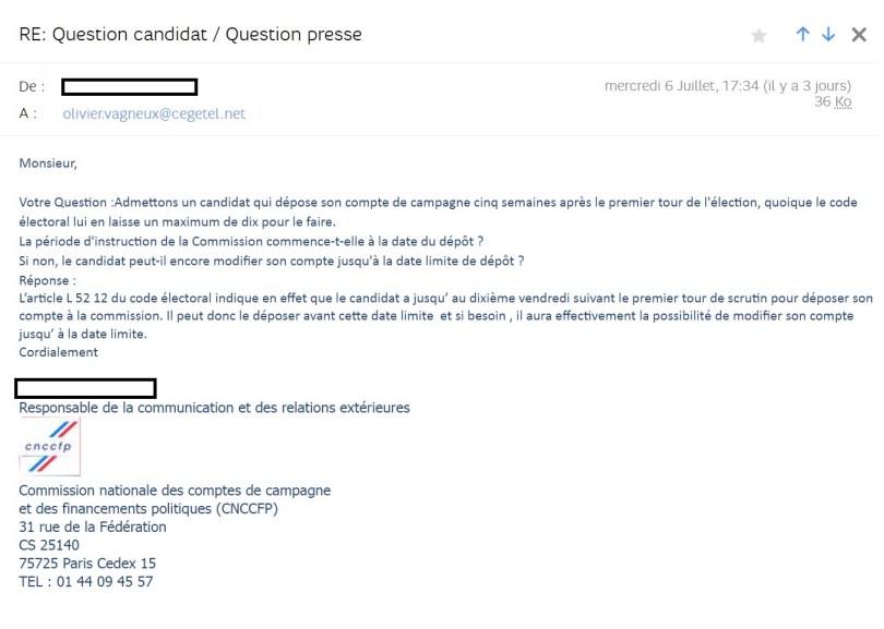 Laquelle me répond qu’il est bien encore possible de modifier son compte de campagne, même après l’avoir déposé, tant que cela est fait avant le dixième vendredi suivant le premier tour à 18 heures.