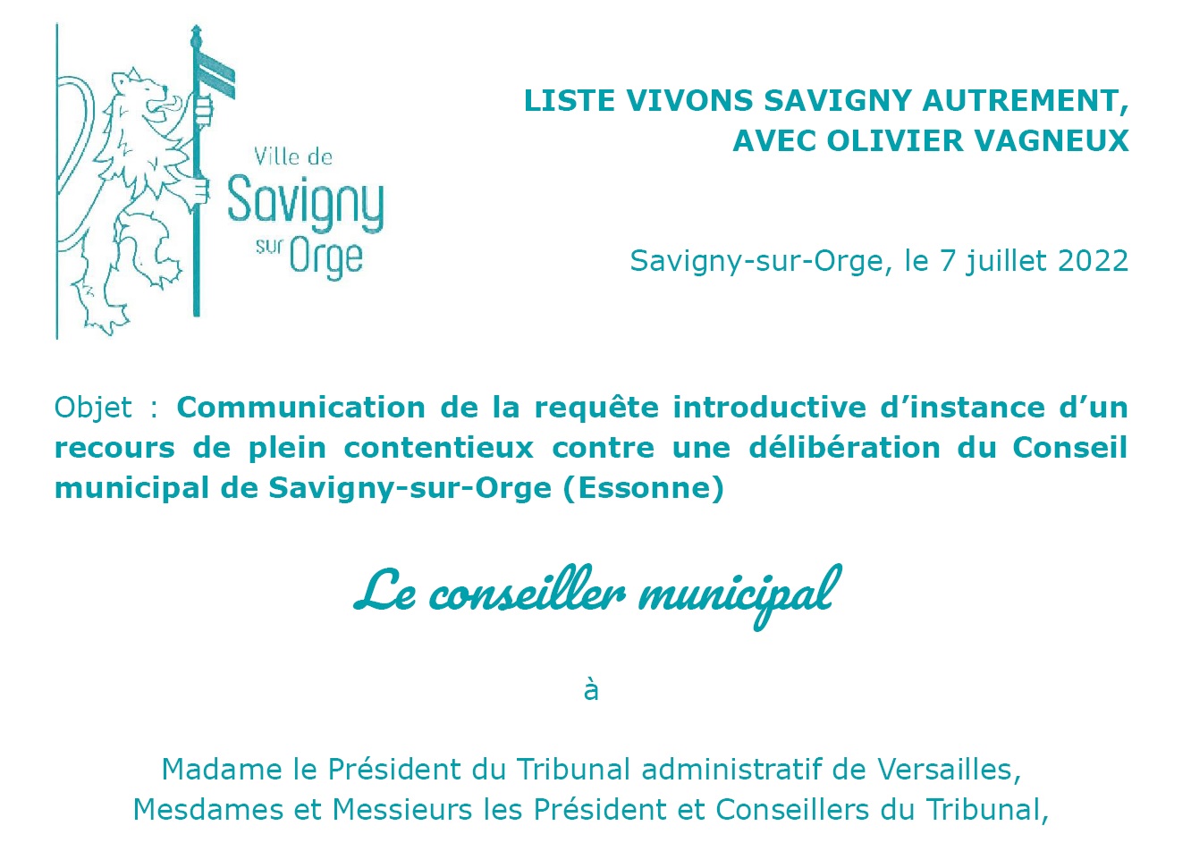 POUR : Monsieur Olivier VAGNEUX, agissant en qualité de conseiller municipal de la Commune de Savigny-sur-Orge, demeurant sis 75, rue du Bicentenaire de la Révolution française – 91600 Savigny-sur-Orge, domicilié en cette qualité en l’Hôtel-de-Ville de la Commune, sis 48, avenue Charles-de-Gaulle – 91600 Savigny-sur-Orge