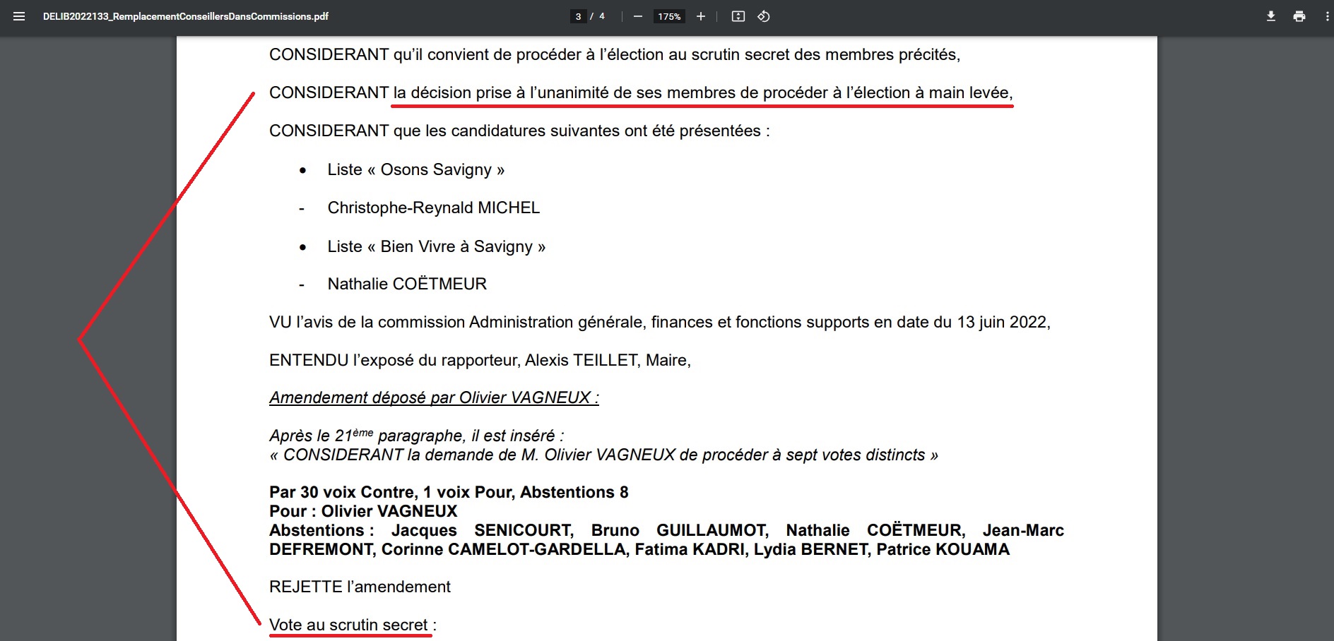 Par suite, le maire de Savigny-sur-Orge ne pouvait valablement pas procéder à ce vote groupé, du moment que je demandais un vote distinct, ce qui apparaît dans mon amendement et figure au surplus sur la vidéo, et dans les débats, du Conseil municipal.