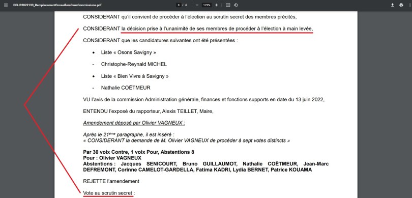 En l’espèce, le 21e paragraphe, non seulement ne correspond pas aux faits puisque j’ai rejeté la demande de procéder à l’élection à main levée, ce qui est aisément vérifiable sur la vidéo du Conseil municipal :