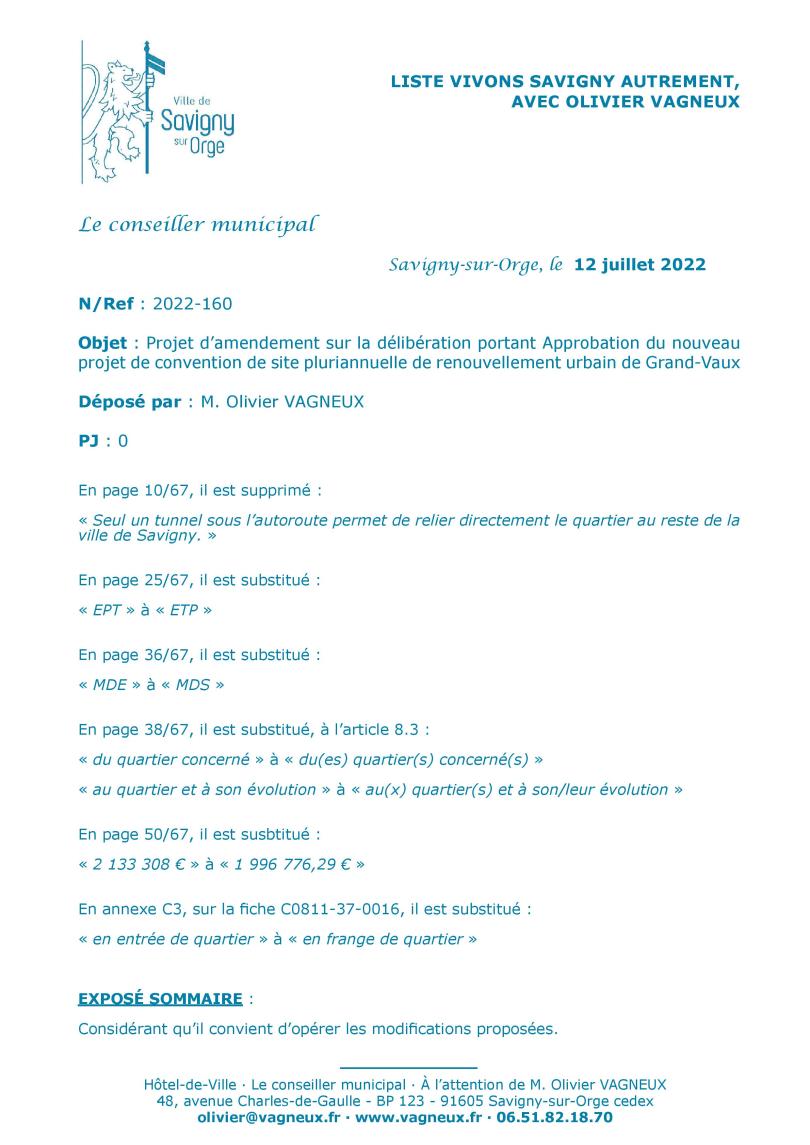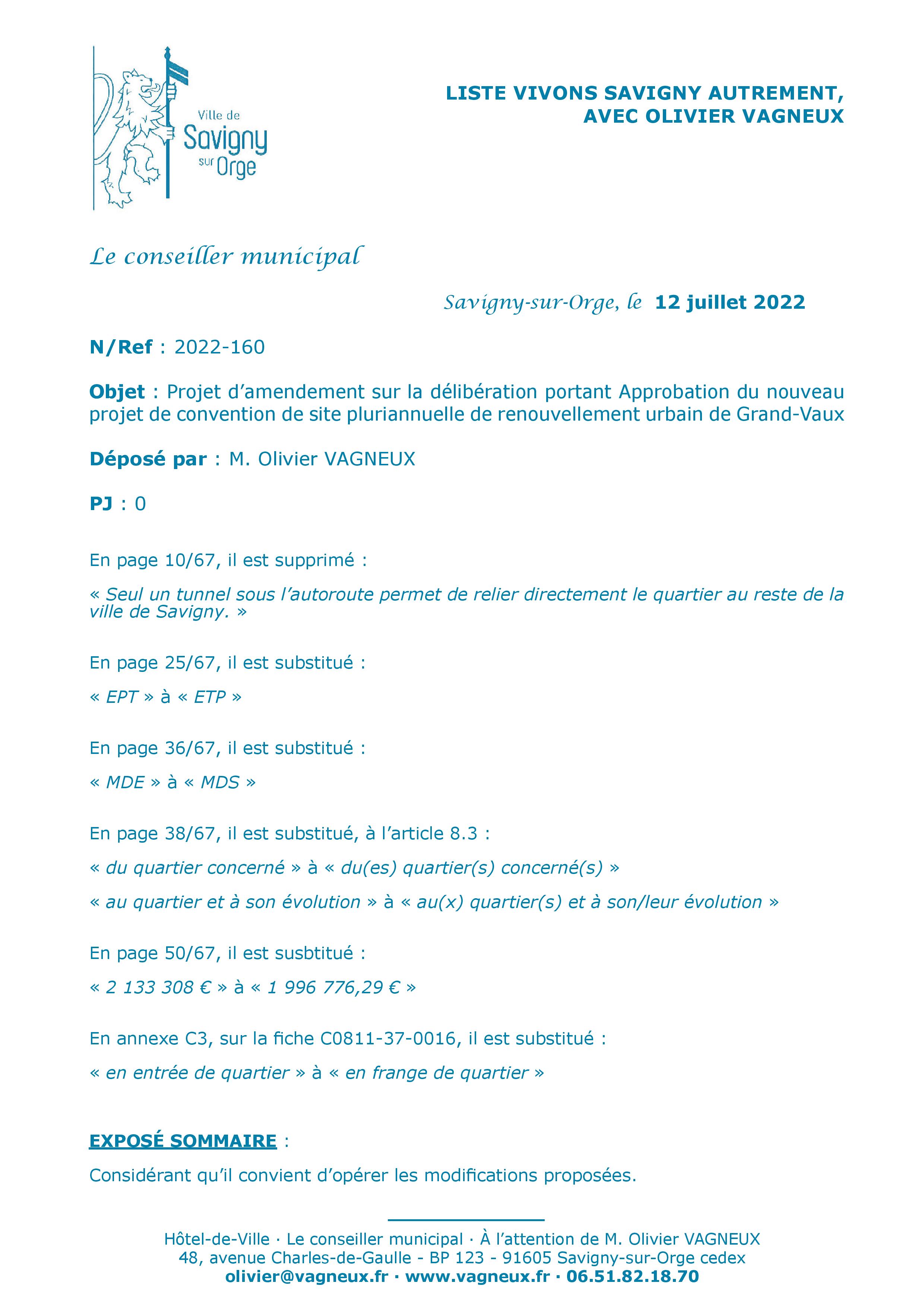 Comme vous ne le savez sûrement pas, la délibération relative à l’approbation de la convention pluriannuelle du projet de renouvellement urbain de Grand-Vaux que le Conseil municipal a adopté ce mardi 12 juillet 2022, dans une incompréhensible précipitation puisque les autres acteurs ne l’adopteront pas avant septembre 2022, est insusceptible de recours. Il me faudra donc attendre la signature de la convention puis sa publication pour pouvoir la déférer devant le Tribunal administratif.