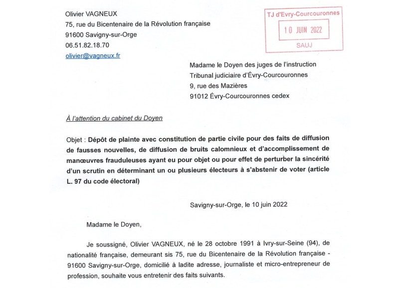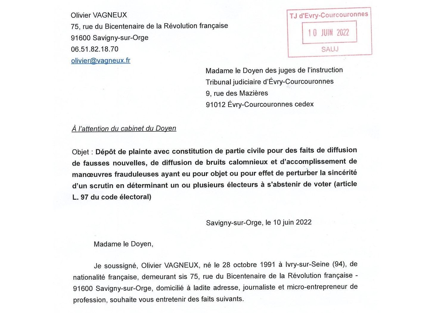 Voici d’ailleurs la preuve du dépôt de ma plainte pour fraude électorale pendant la campagne municipale.