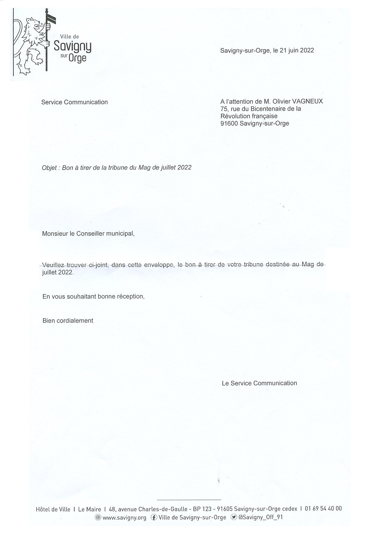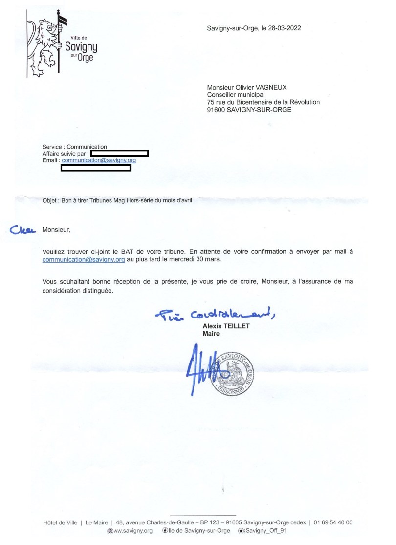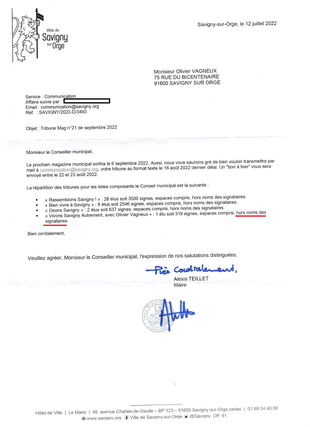 Mais en même temps, leur maire ne doit pas avoir les complexes du nôtre, et ce besoin de viser tous les courriers, ce qui à Savigny, prend toujours de très longs jours…
