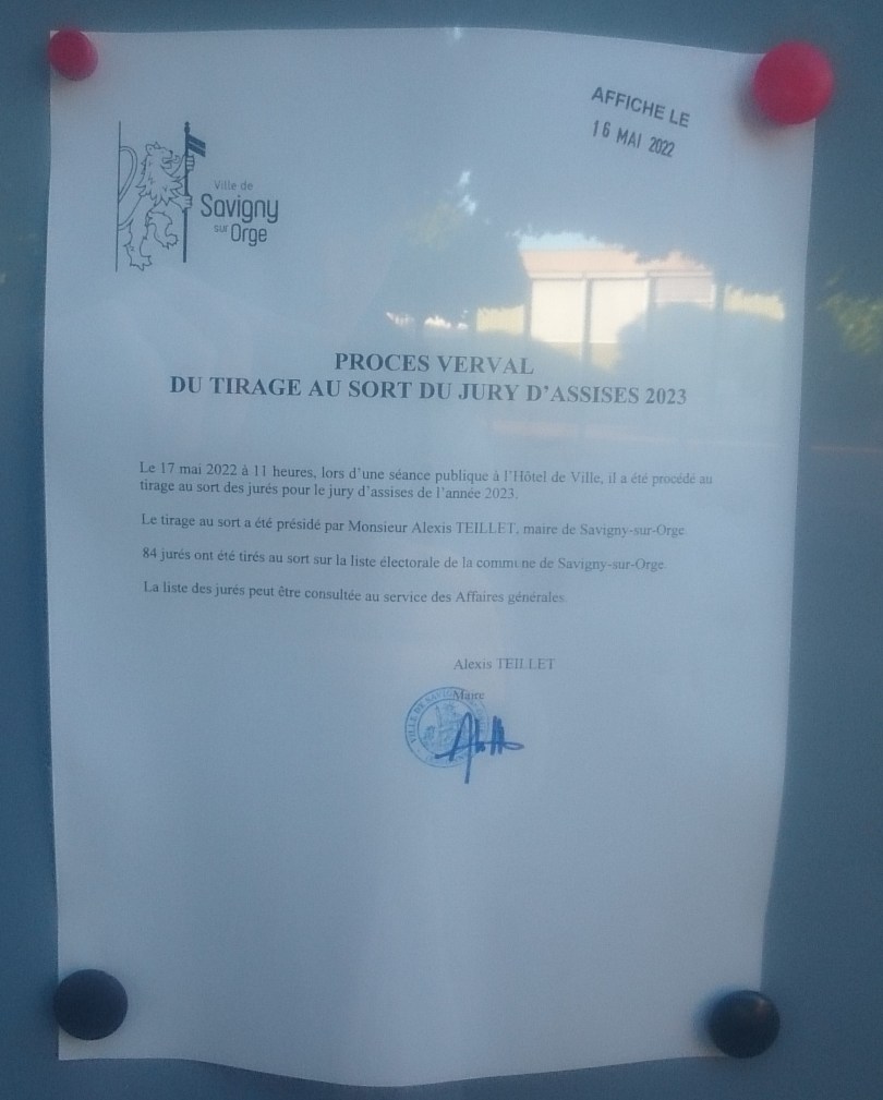 Ça va que j’étais la seule personne du public en folie, qu’écris-je de la foule en délire, présente à ce tirage au sort de la liste préparatoire des jurés d’assises du 17 mai 2022, et donc que j’ai vu TEILLET personnellement procéder audit tirage au sort puis établir et signer ce procès-verbal…