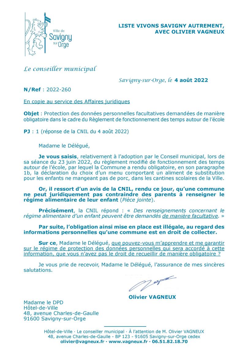 Parents de Savigny-sur-Orge, la CNIL m’écrit que vous avez le DROIT de refuser de renseigner le régime alimentaire de vos enfants !!!