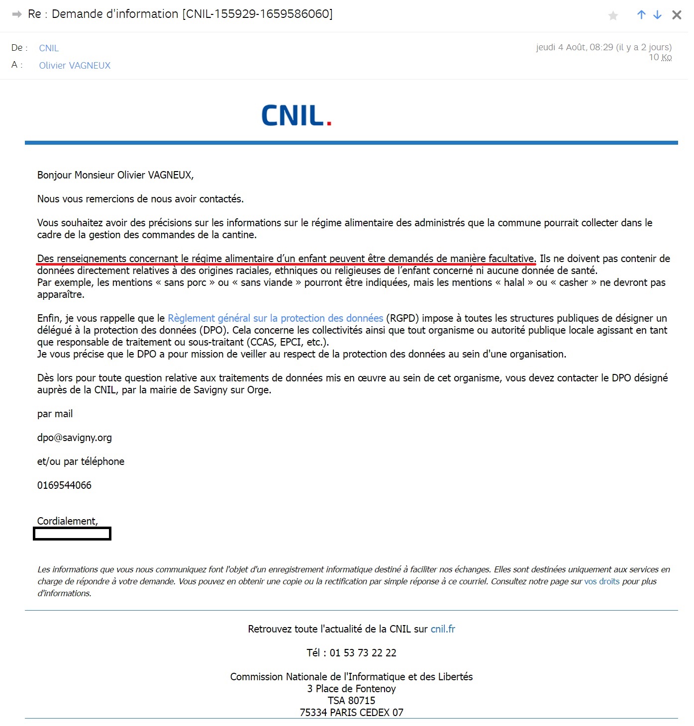 Parents de Savigny-sur-Orge, la CNIL m’écrit que vous avez le DROIT de refuser de renseigner le régime alimentaire de vos enfants !!!