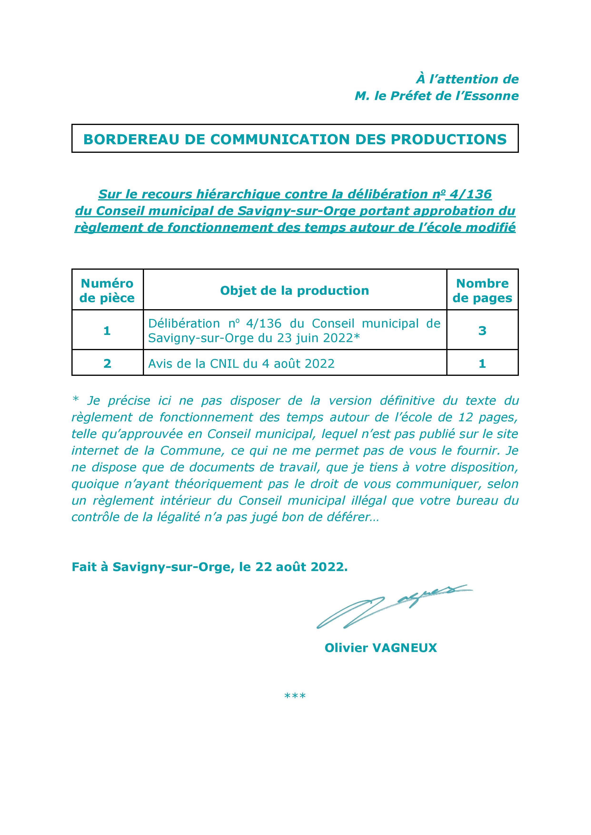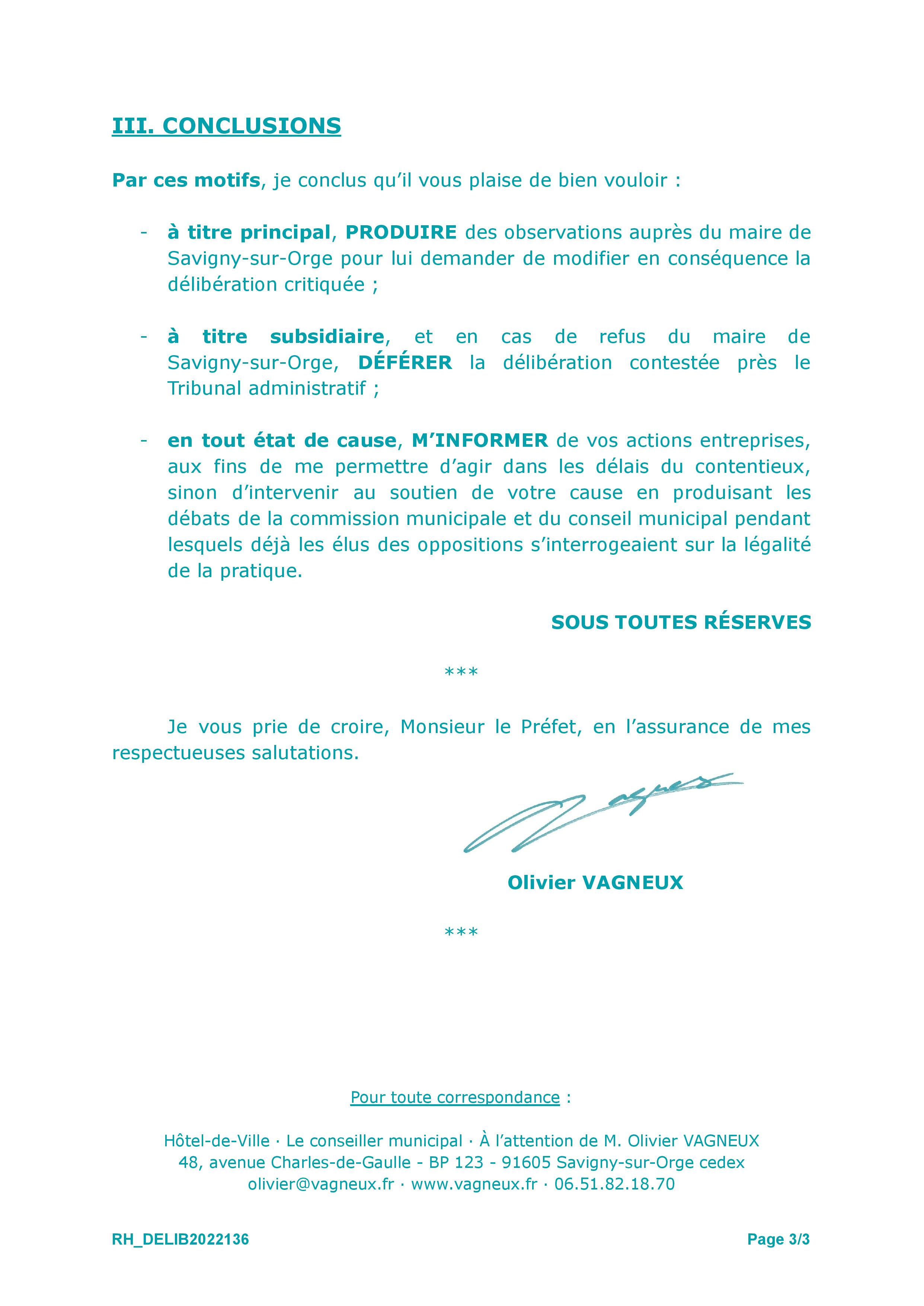 Il s’agit de la délibération contre laquelle je vous demande d’agir par la production d’observations près le maire de Savigny-sur-Orge.