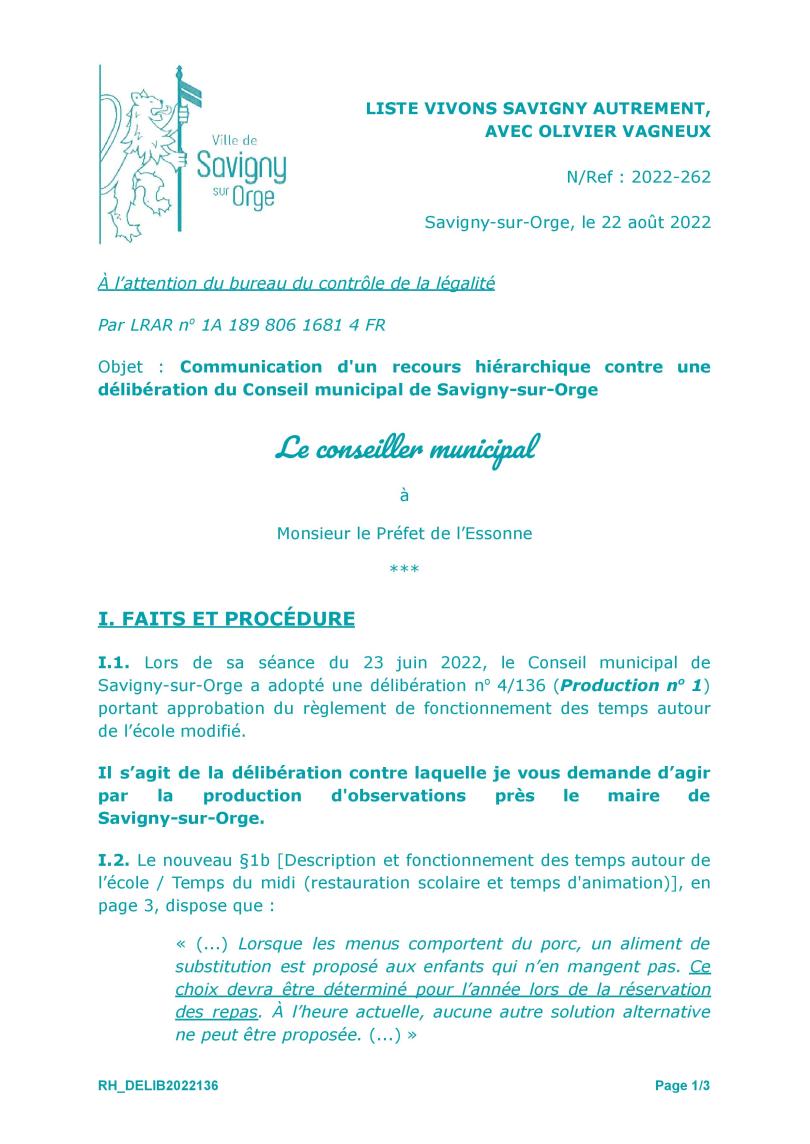 Sur le recours hiérarchique contre la délibération no 4/136 du Conseil municipal de Savigny-sur-Orge