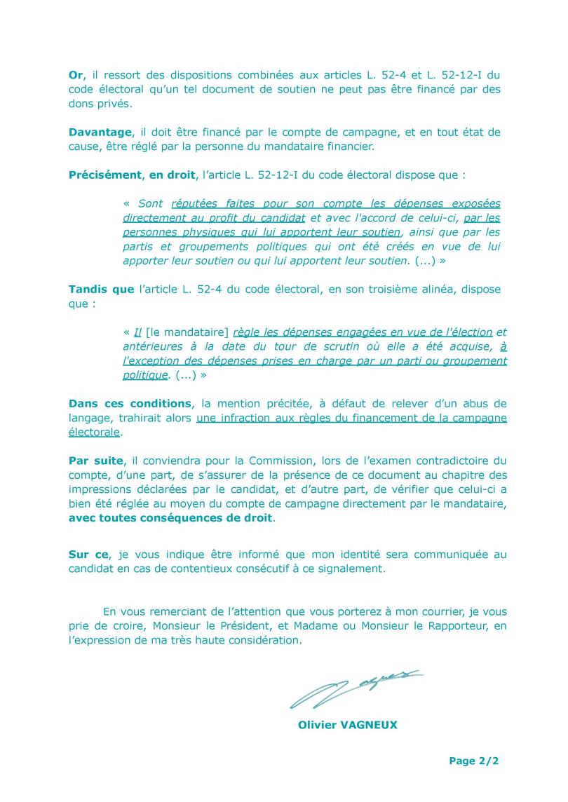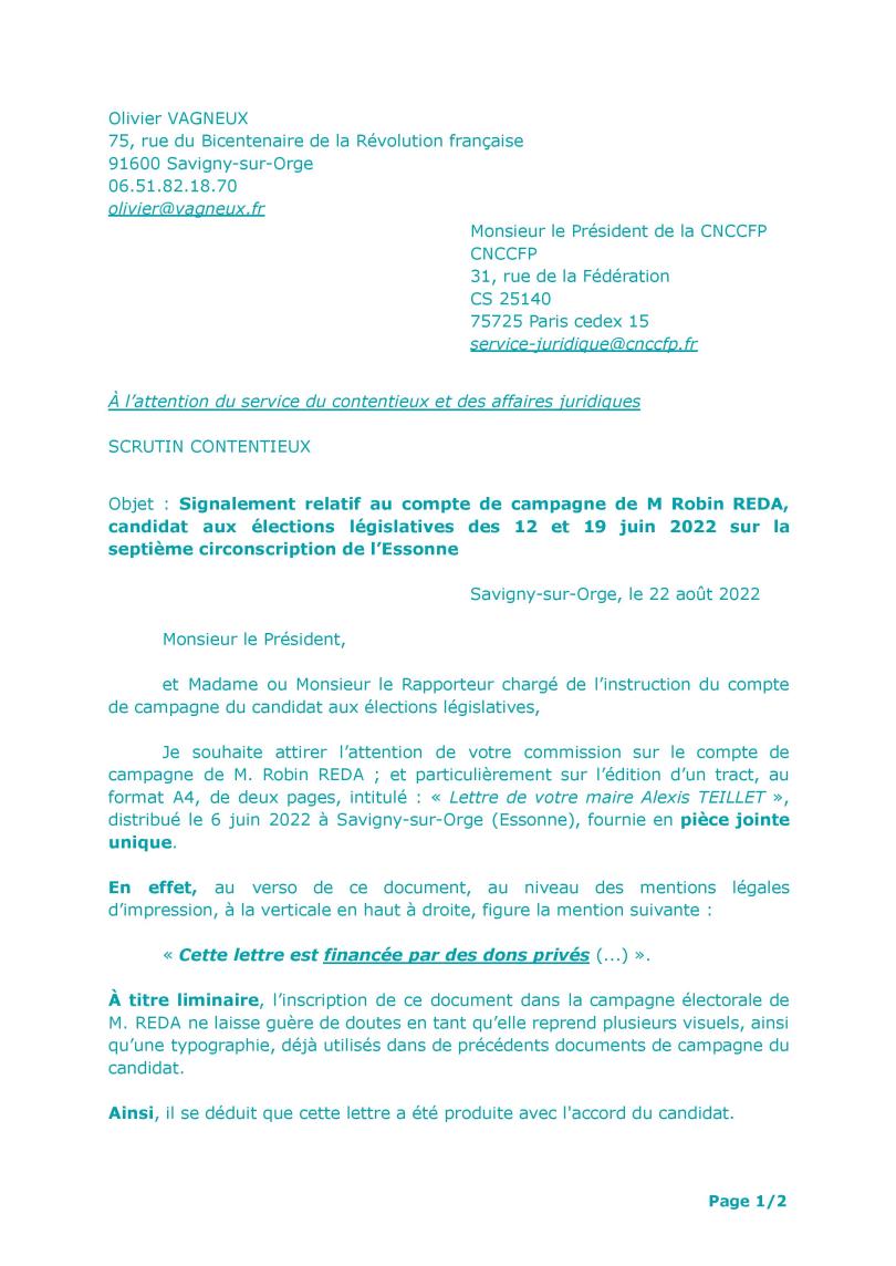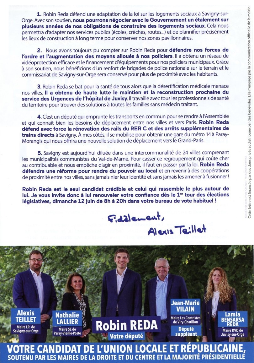 Je souhaite attirer l’attention de votre commission sur le compte de campagne de M. Robin REDA ; et particulièrement sur l’édition d’un tract, au format A4, de deux pages, intitulé : « Lettre de votre maire Alexis TEILLET », distribué le 6 juin 2022 à Savigny-sur-Orge (Essonne), fournie en pièce jointe unique.
