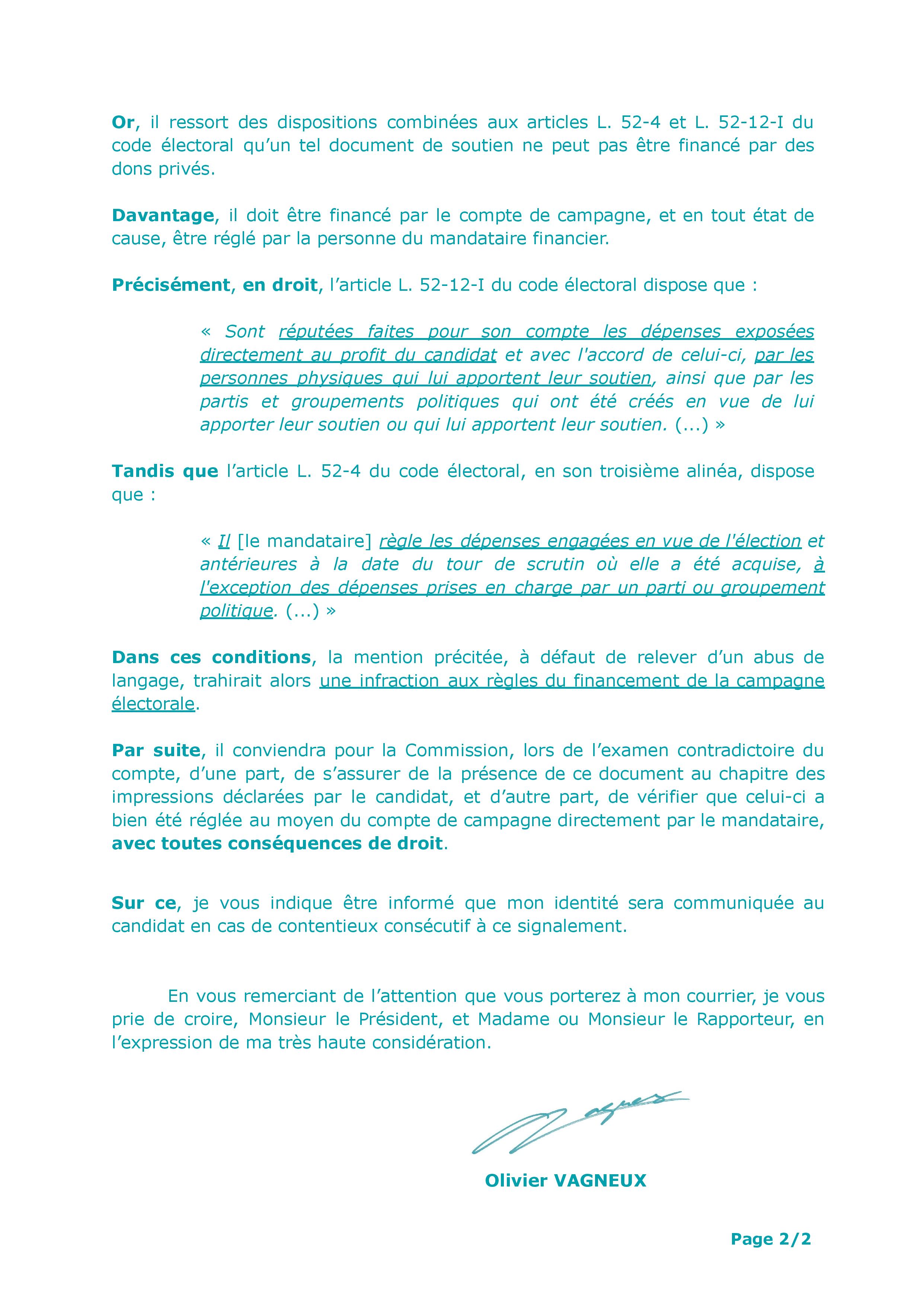 Je souhaite attirer l’attention de votre commission sur le compte de campagne de M. Robin REDA ; et particulièrement sur l’édition d’un tract, au format A4, de deux pages, intitulé : « Lettre de votre maire Alexis TEILLET », distribué le 6 juin 2022 à Savigny-sur-Orge (Essonne), fournie en pièce jointe unique.