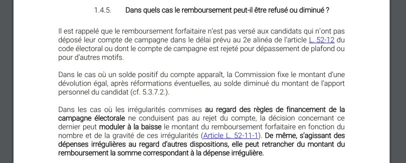 Un client me demande si le probable rejet de son compte de campagne (j’avoue qu’il a fait fort. Il me demande de sauver ses fesses. Je lui ai répondu que je pouvais lui empêcher l’inéligibilité mais que je voyais difficilement comment son compte pourrait être approuvé en l’état. Après, je comprends beaucoup de ses erreurs car je suis aussi passé par là. Surtout quand derrière, les partis politiques ; pas plus que les experts comptables pourtant chèrement rémunérés, ne vous soutiennent absolument pas au moment opportun.)