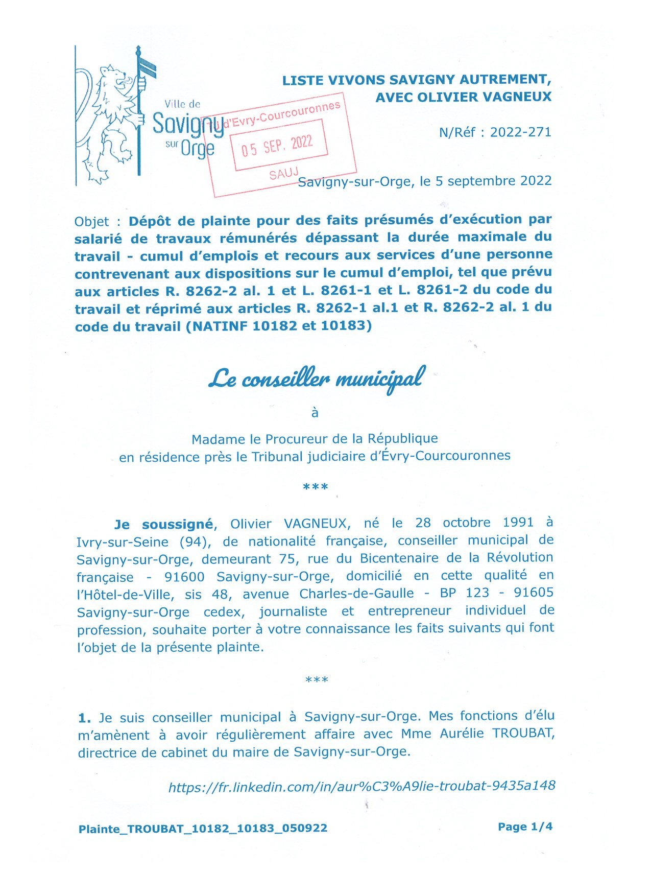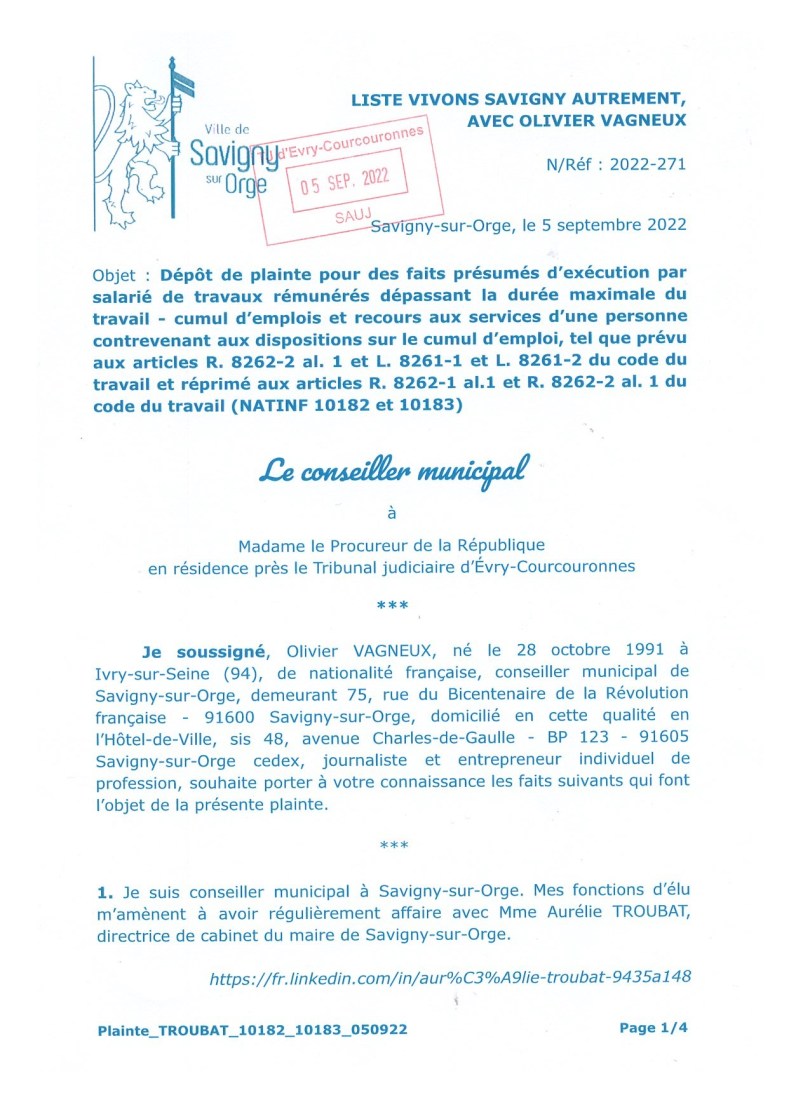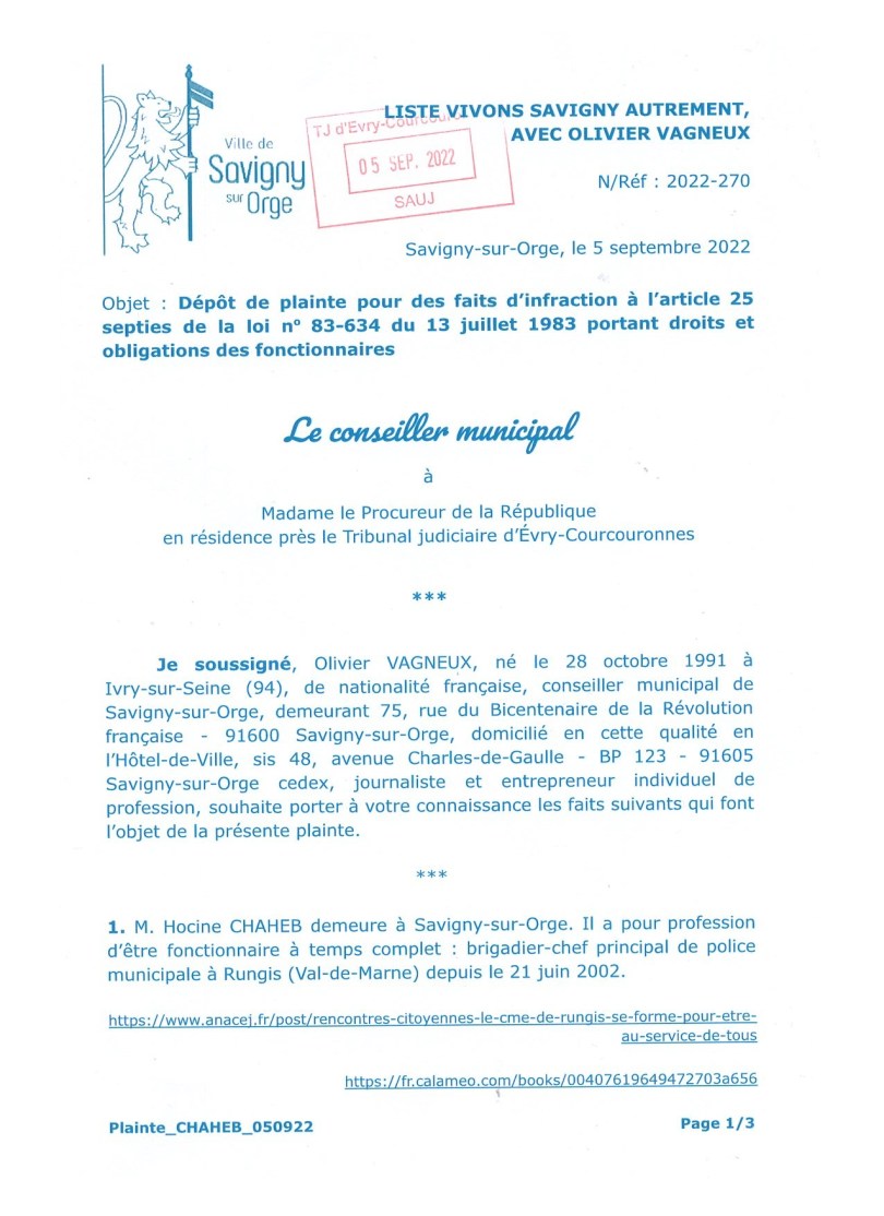 Je soussigné, Olivier VAGNEUX, né le 28 octobre 1991 à Ivry-sur-Seine (94), de nationalité française, conseiller municipal de Savigny-sur-Orge, demeurant 75, rue du Bicentenaire de la Révolution française – 91600 Savigny-sur-Orge, domicilié en cette qualité en l’Hôtel-de-Ville, sis 48, avenue Charles-de-Gaulle – BP 123 – 91605 Savigny-sur-Orge cedex, journaliste et entrepreneur individuel de profession, souhaite porter à votre connaissance les faits suivants qui font l’objet de la présente plainte.