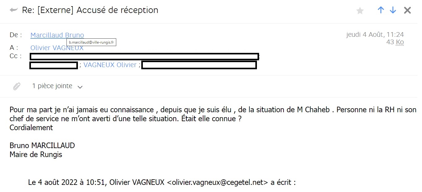 - une, avec la complicité du maire de Rungis – j’expliquerai tout cela plus tard, qui vise le cumul d’emplois de Hocine CHAHEB, éphémère conseiller municipal qui a démissionné pour « raisons professionnelles » que TEILLET a décrit comme « incompatibilités ». Moi, la seule que je vois, c’est qu’il cumule d’être policier municipal et entrepreneur individuel d’une société de taxi. À partir de là, la loi dit qu’il faut déduire et rembourser de son salaire de fonctionnaire le montant de ses revenus en tant qu’entrepreneur.
