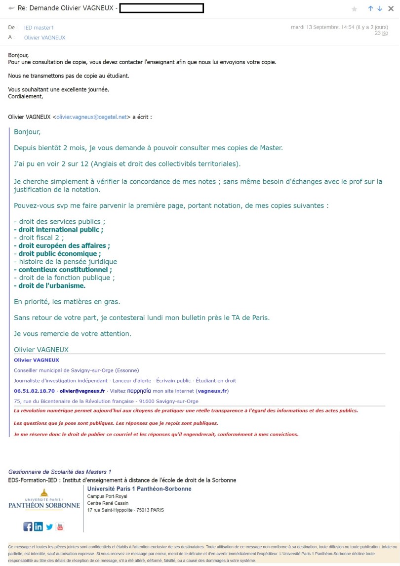 Acte I : Le 13 septembre, l’Université me dit qu’elle ne transmet pas les copies aux étudiants.