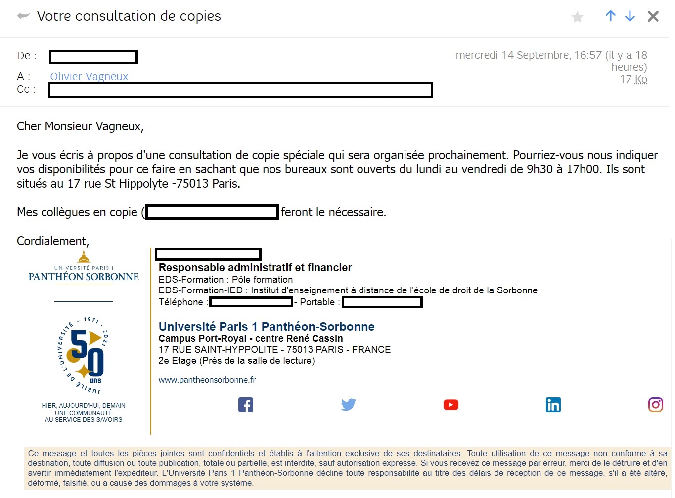 Acte III : Le 14 septembre, l’Université organise une « session spéciale » de consultation de copies (adaptée à mes disponibilités).