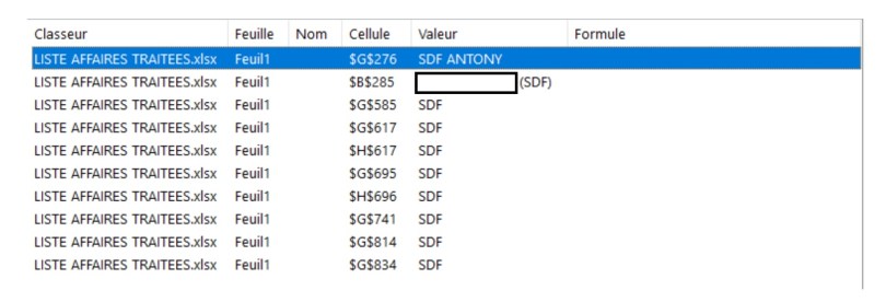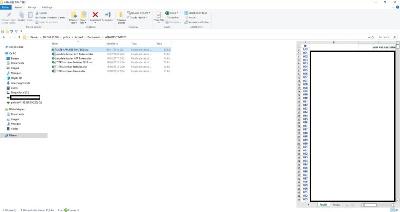 Plusieurs fichiers Excel indiquent les nom, prénoms, adresses et téléphones, un ou plusieurs numéros de dossiers censés correspondre à un numéro d’affaire traitée, ainsi qu’un motif.