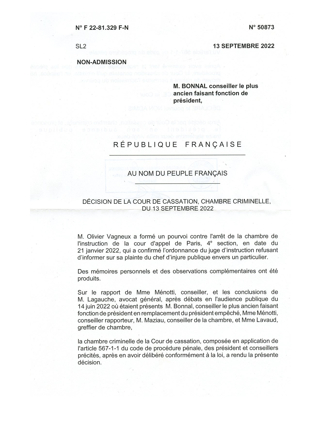 Et c’est un peu quand même une victoire puisque le conseiller rapporteur et l’avocat général demandaient la non-admission sur le fondement de l’irrecevabilité, donc que j’ai dépassé cette irrecevabilité, qui est un motif de rejet d’office, alors que je perds sur le fondement du bien-fondé !